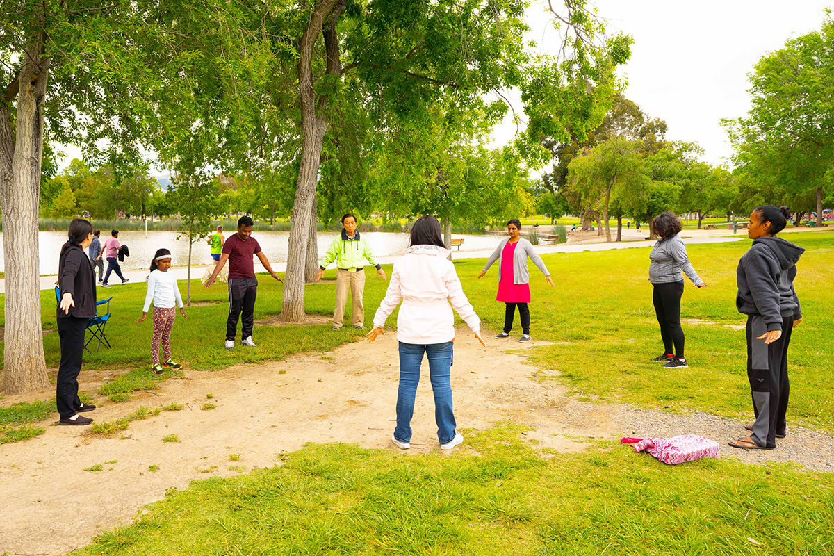 位于旧金山东湾的佛利蒙(Fremont),风景秀丽,许多市民喜欢沿着公园的伊丽莎白湖边散步。当天不少散步的民众看到法轮功免费教功班,就加入学功,体验一下法轮功功法。
