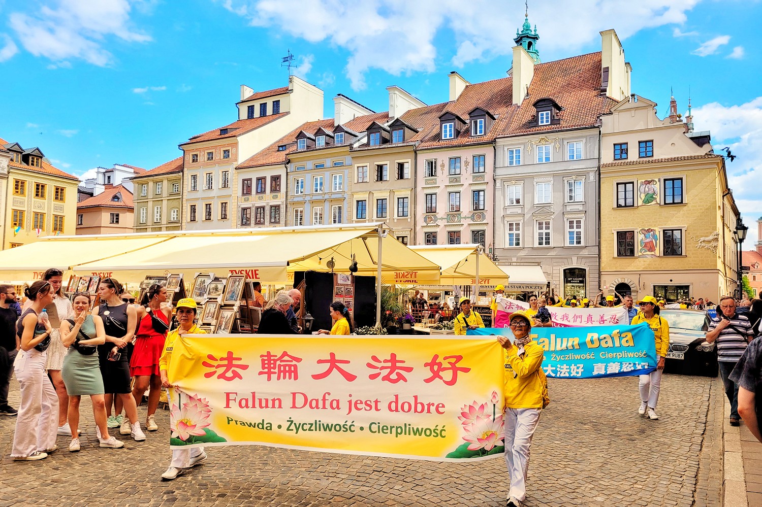 游行队伍随着欢快的锣鼓声起,率先从华沙五街口广场(Plac Pięciu Rogów)出发,一面“法轮大法好”横幅首先映入民众的眼帘,而后上下飞舞的金龙在湛蓝的天空下闪闪发光。“法轮大法教我们真、善、忍”、“停止迫害法轮功”等横幅。