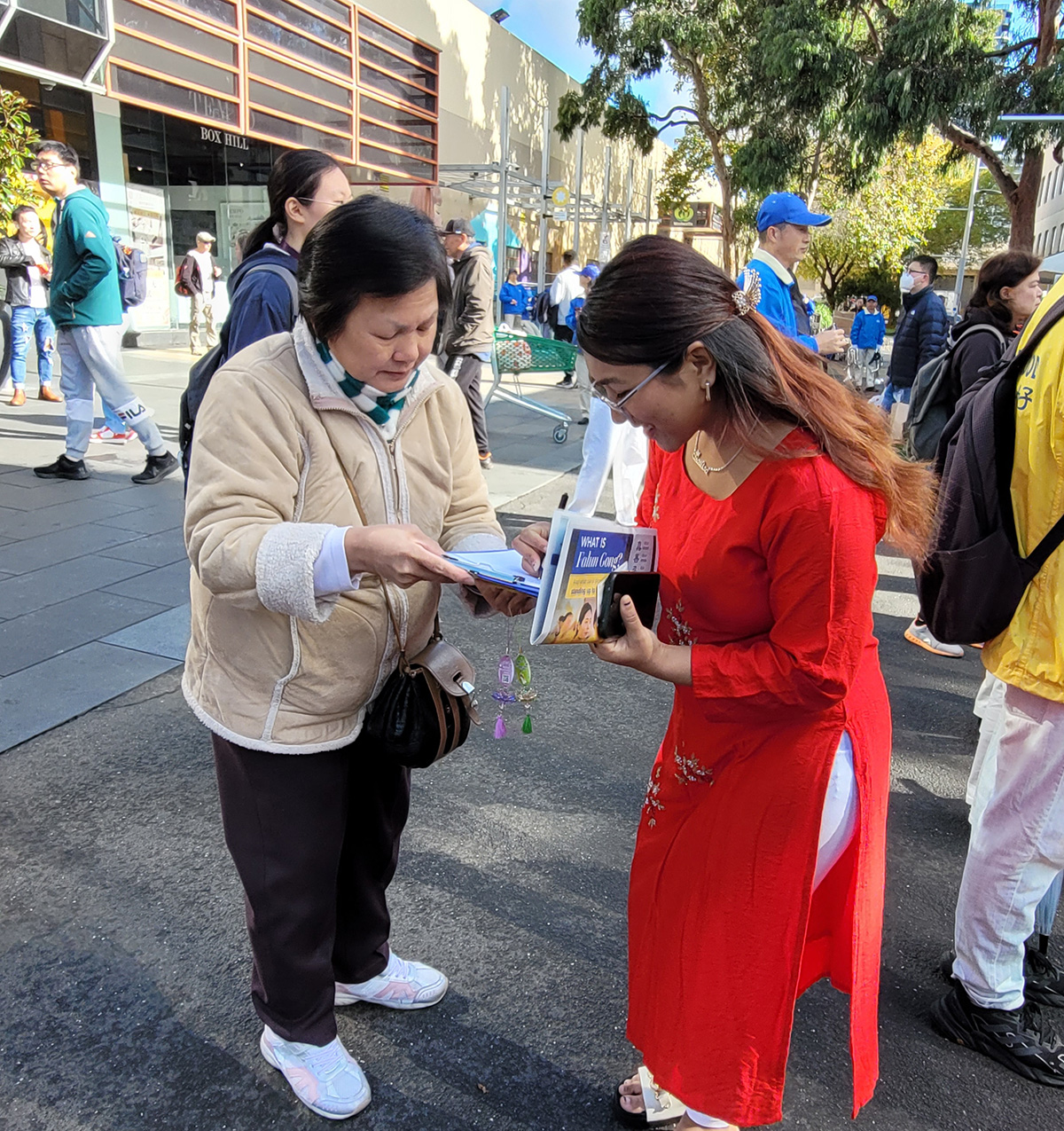 【明慧网二零二三年五月二十五日】(明慧网澳洲墨尔本记者站)二零二三年五月二十日中午,澳洲墨尔本博士山(Box Hill)购物中心广场举行了集会,欢庆第二十四届“世界法轮大法日”,并恭贺法轮功创始人李洪志师父华诞。