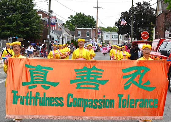 五月二十八日,在美国费城西郊涡流石市举行的“国殇日游行”中,法轮功学员腰鼓队第一次受邀参加,他们以出众的表演赢得了当地民众的喜爱和赞誉。