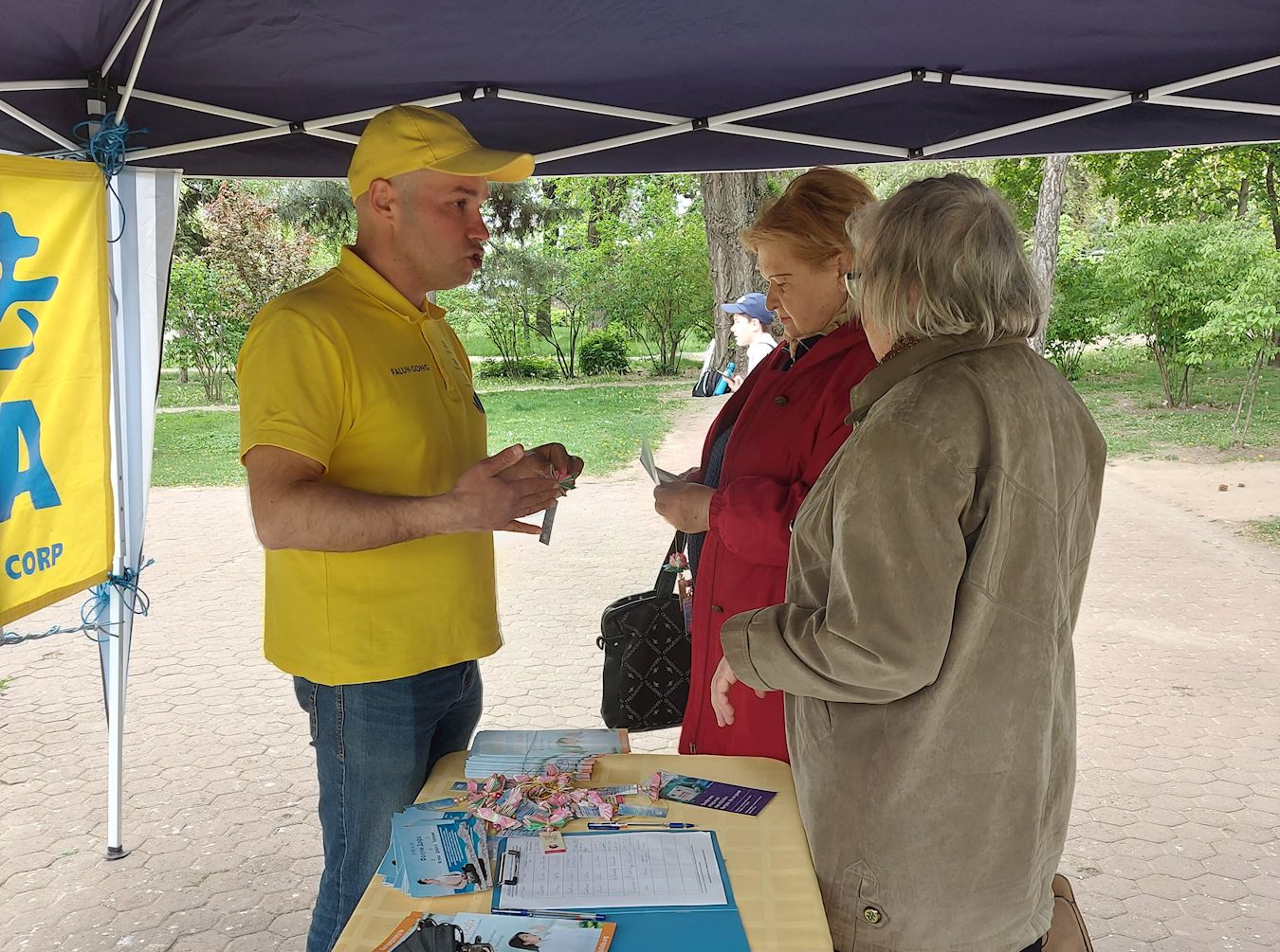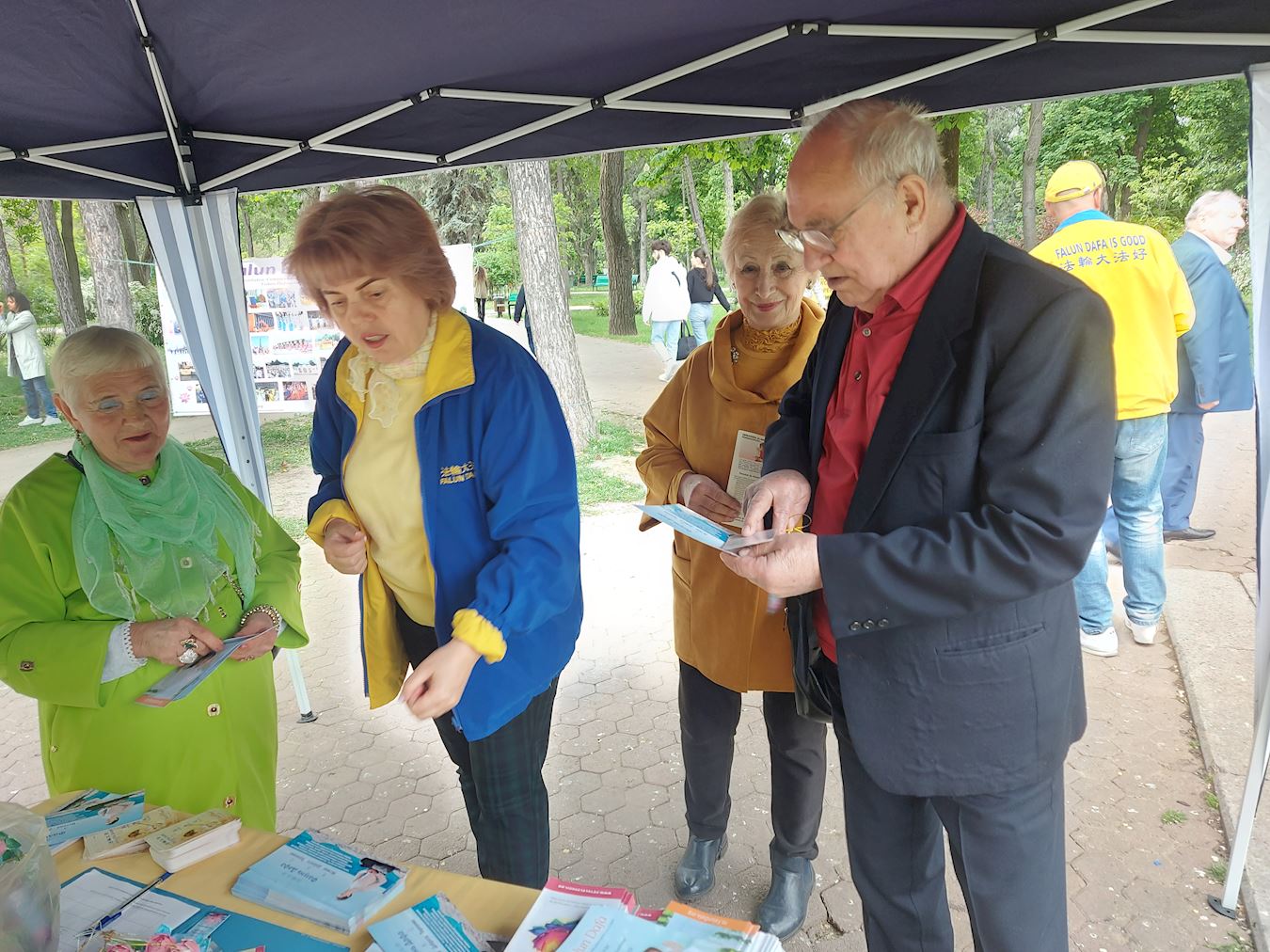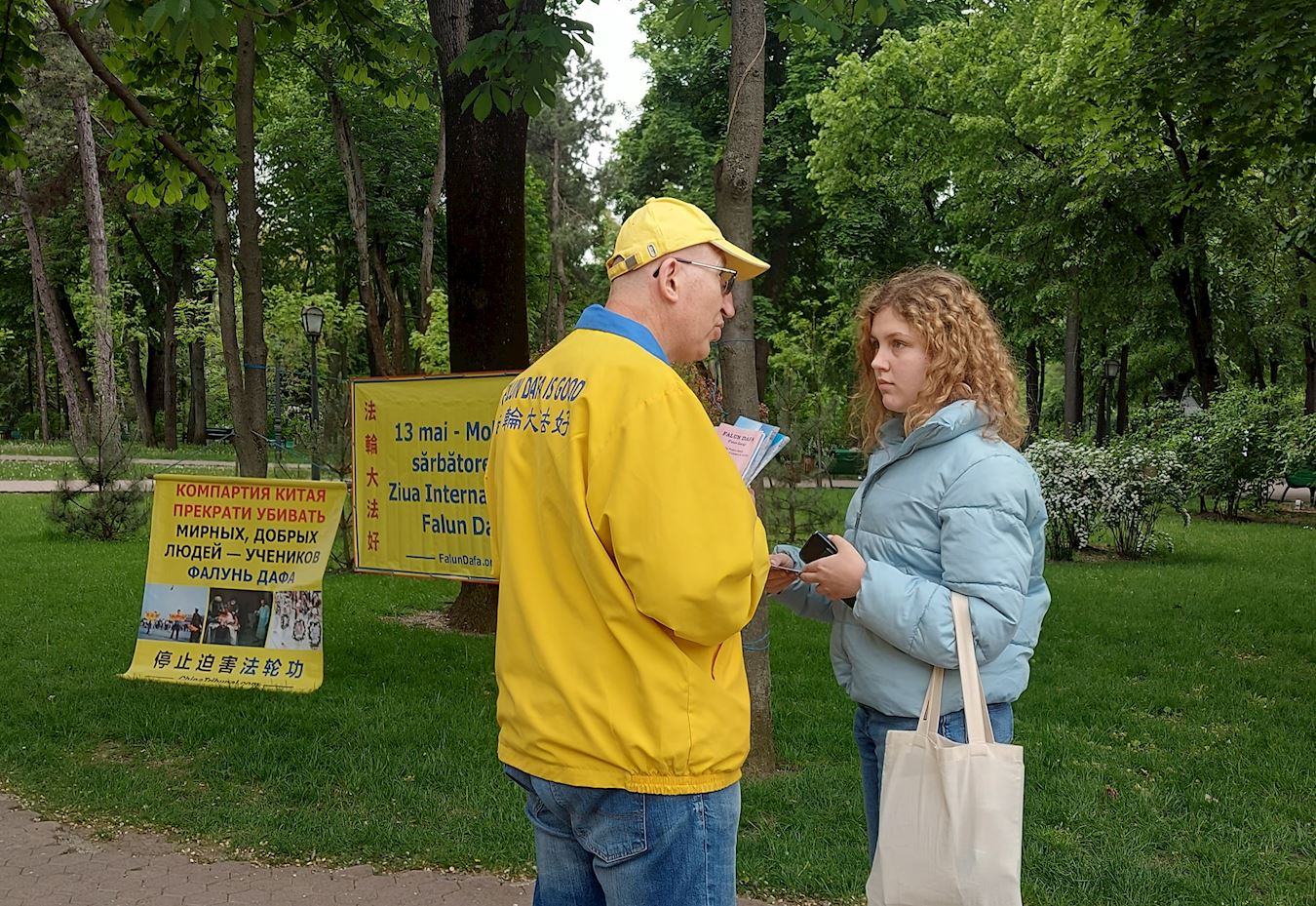 在摩尔多瓦法轮功学员庆祝世界法轮大法日的当天,正值欧洲日庆祝活动期间,欧盟将五月九日定为欧洲日,以庆祝欧洲的和平统一。因此,许多游客纷纷前来,在法轮功的展位前停下脚步,以获取更多信息。