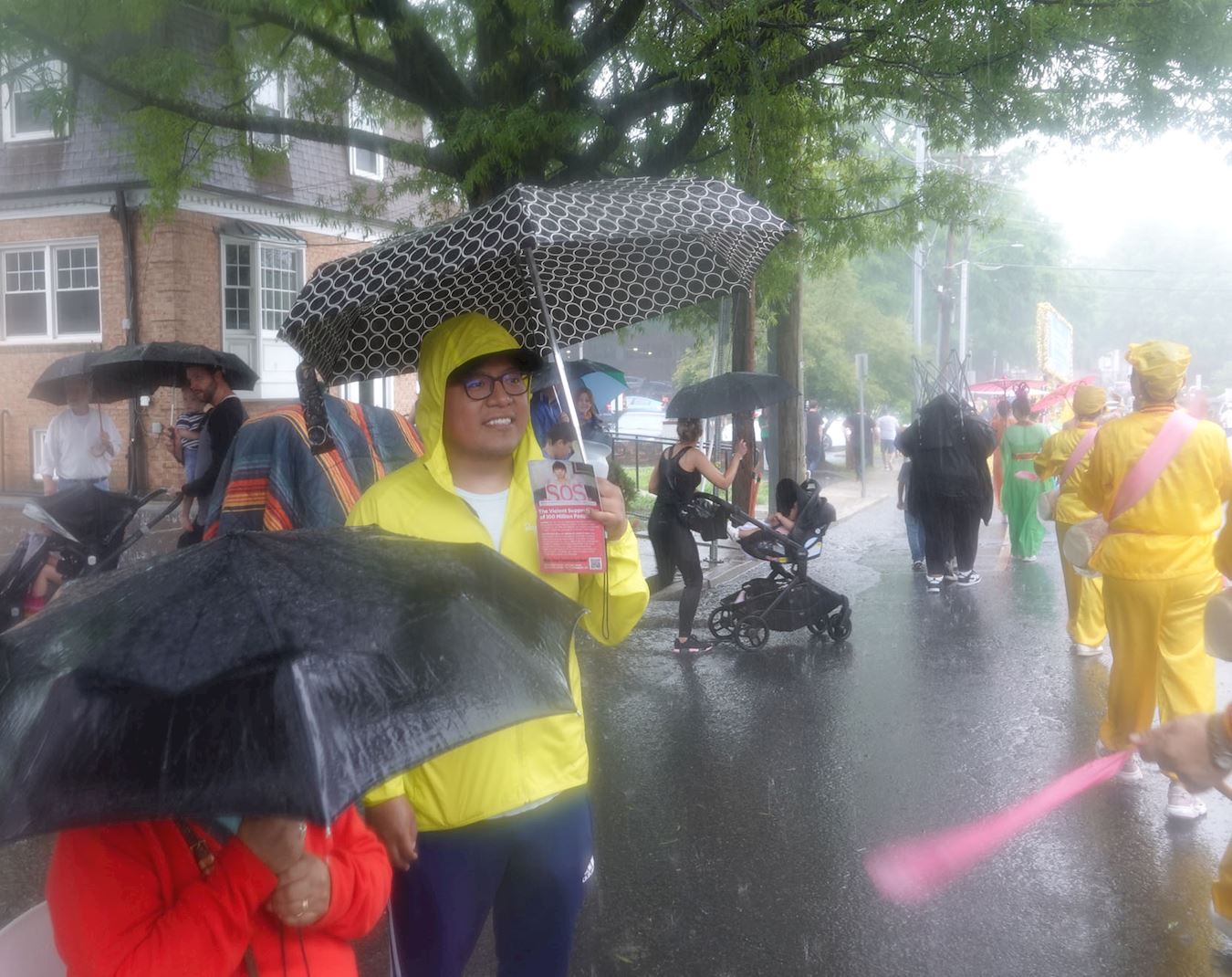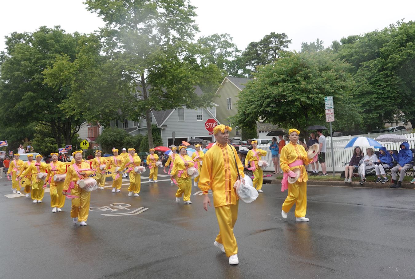 图2:五月二十九日下午,大华府地区部分法轮功学员参加了华盛顿近郊弗吉尼亚州瀑布教堂市(Falls Church)的游行,他们冒雨走完游行全程。