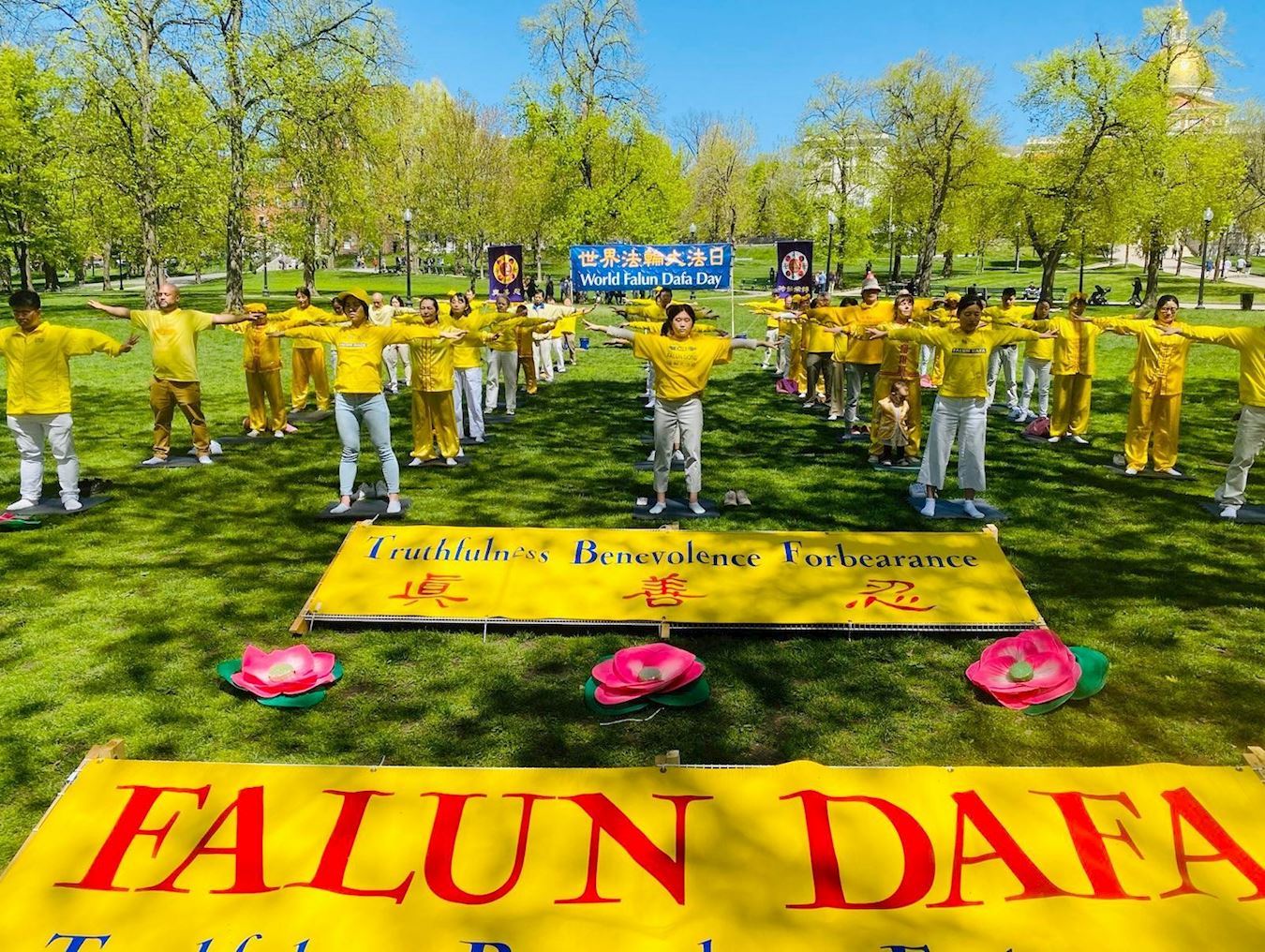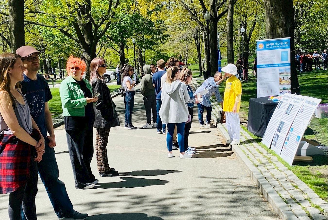 暮春的波士顿公园阳光明媚,惠风和畅,一早就挤满了周末踏青的人。熙熙攘攘的人群从活动现场经过,络绎不绝。悠扬的炼功音乐和学员们整齐划一的动作,让他们眼前一亮,感到一种祥和宁静的能量场。吸引市民及游客驻足观看,有的拿起手机拍照。