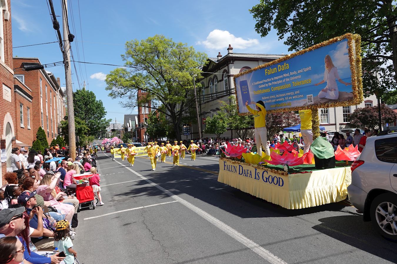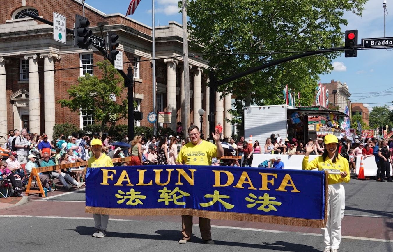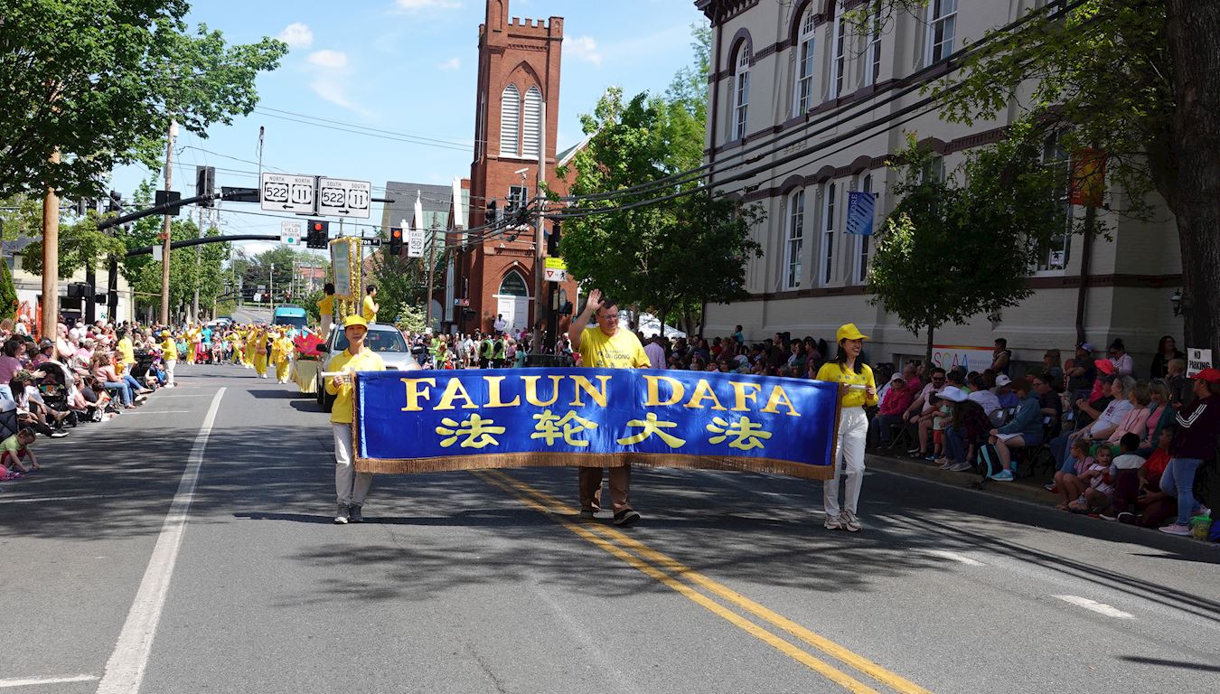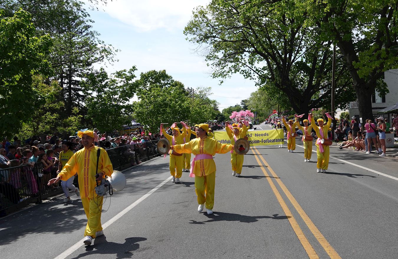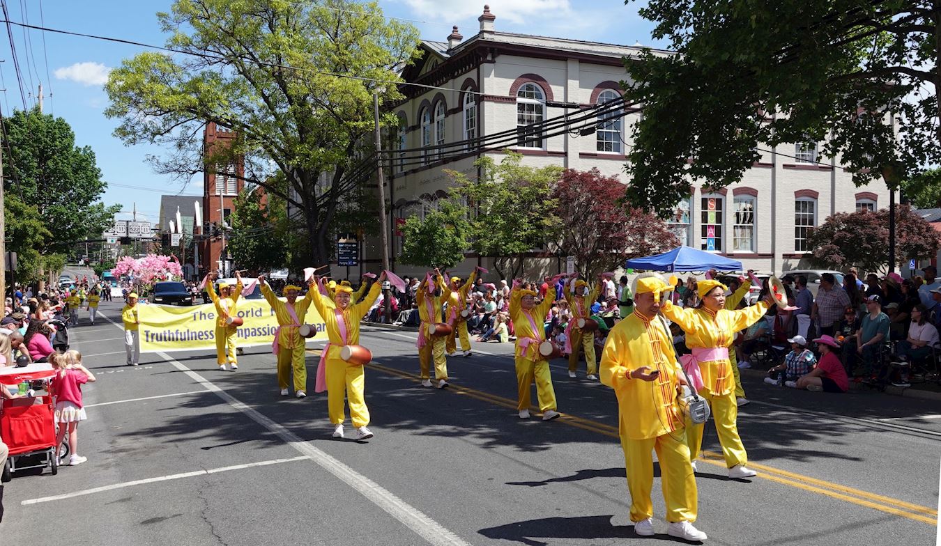 图1~4:二零二三年五月六日,法轮功学员应邀参加美国弗吉尼亚州温彻斯特市一年一度的苹果花节(The Shenandoah Apple Blossom Festival)游行。