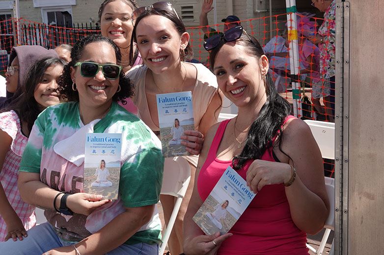 当法轮功游行队伍行进至主席台前,活动主办方向当地民众介绍说:“法轮大法是一种传统的修炼修行功法,以宇宙特性‘真、善、忍’为原则,包含五套柔和的功法动作和打坐。”主办方还为当地民众提供了法轮大法网站的信息。
