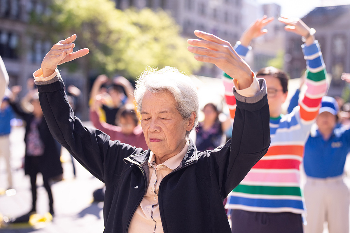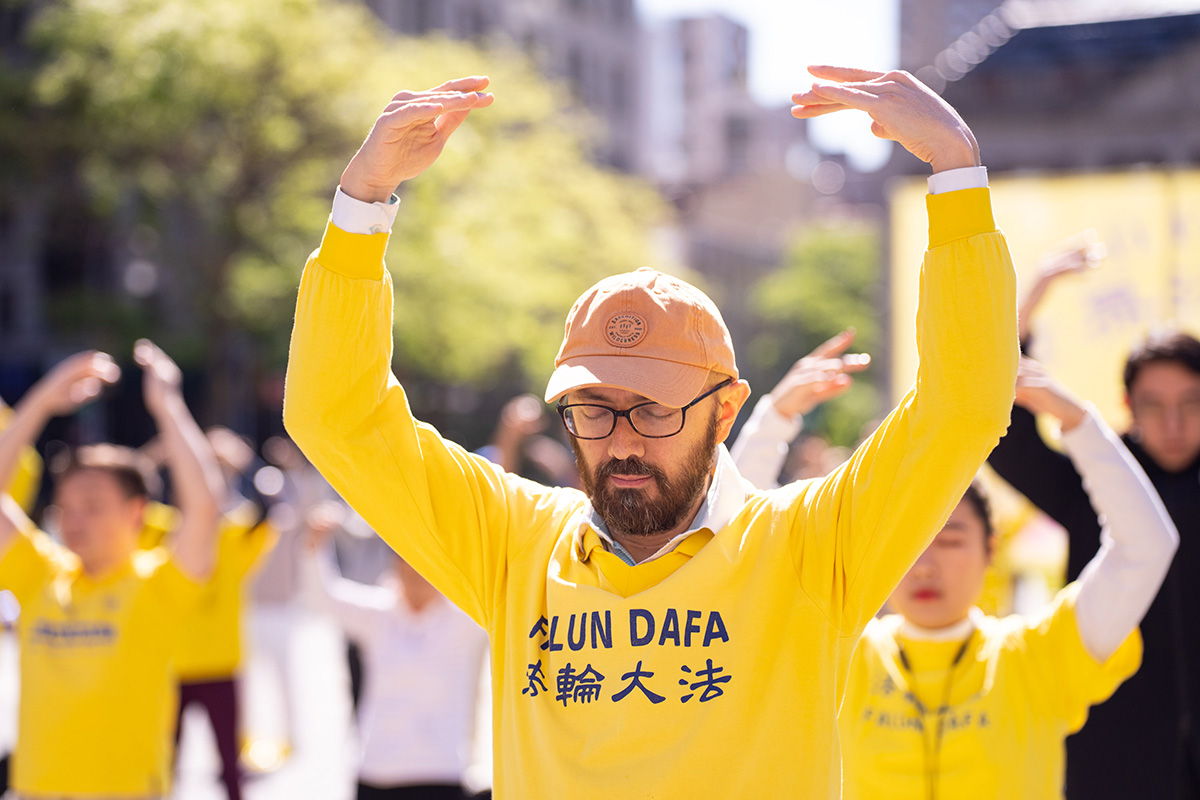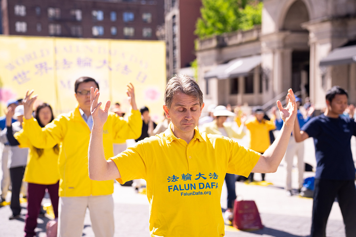 五月七日上午,法轮功学员在曼哈顿的联合广场上集体炼功。各族裔大法弟子,有银发的奶奶,有阳光的少年,每个人都非常专注,明媚阳光下,炼功场面分外的美好祥和,不少行人驻足观看,拍照摄影。当地居民告诉学员,他们每年都能看到法轮功学员在这里举办活动,非常好。有来自意大利的游客很高兴在这里看到法轮功,他们在意大利也看到过,有所了解。有些是第一次接触到法轮功,当场就打开传单快速的阅读。