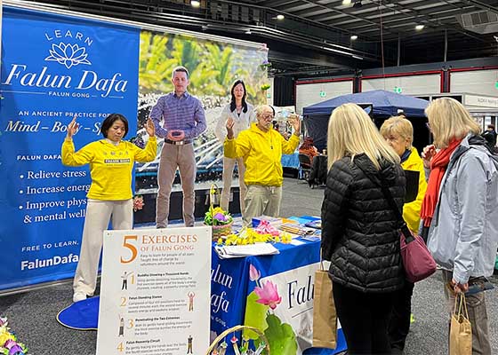 二零二三年五月二十八和二十九日,在澳大利亚阿德莱德会展中心举办的健康博览会上,法轮功学员的展位受到欢迎。