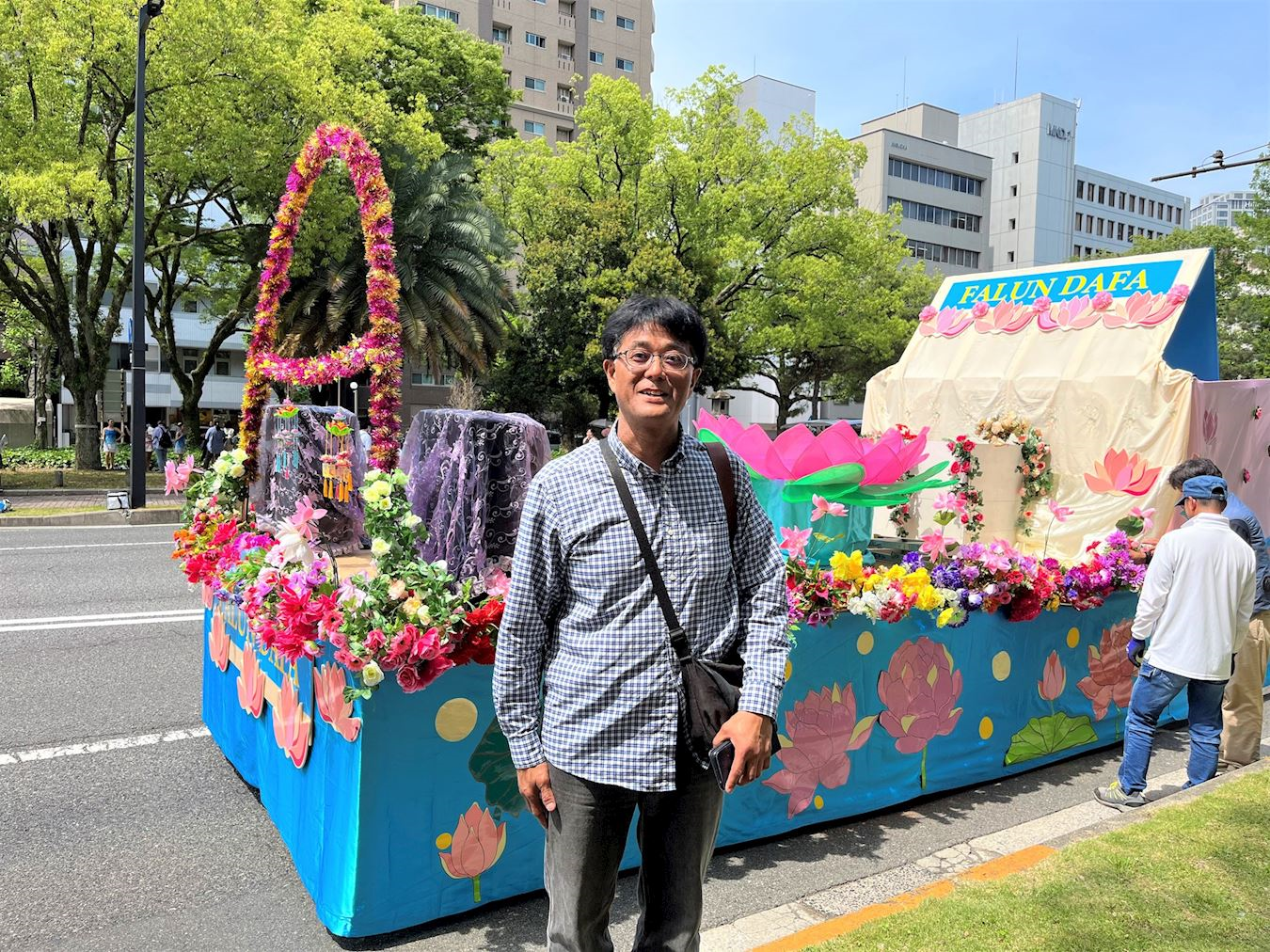 尾崎由典(Ozaki Yosinori)先生是从冈山县专程来广岛观看鲜花节的,法轮功团体在表演开始之前,他就在一旁静静地看着。