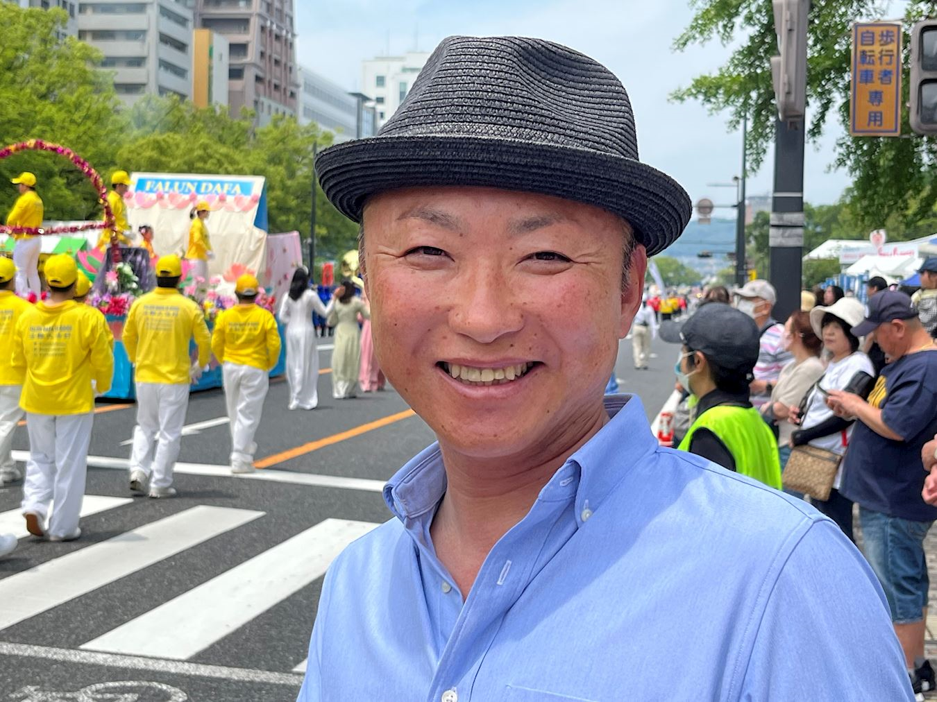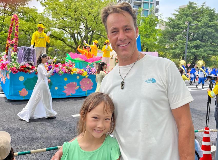 观看游行表演的武田正崇(Takeda Masataka)先生说:“法轮功团体的队伍振奋人心,太棒了。”