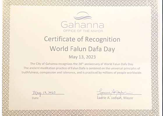 在庆祝法轮大法弘传三十一周年,第二十四届“世界法轮大法日”之时,美国俄亥俄州加汉纳市市长劳里·贾德温签发证书表彰世界法轮大法日。