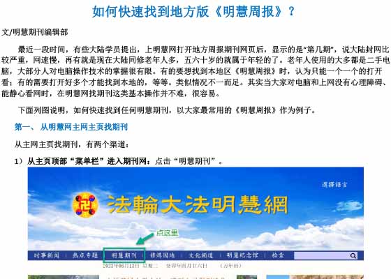 列图说明,如何快速找到任何明慧期刊,以大家最常用的《明慧周报》作为例子。