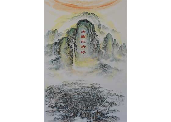 通过气势磅礴的山峰,淡淡的浅黄色光圈寓意法轮转动,以此来体现出大法的洪大慈悲与救度。