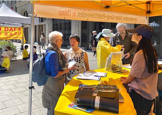 五月二十七日,德国法轮功学员在慕尼黑市内步行街举办活动,展示法轮功的美好,揭露中共迫害及活摘法轮功学员器官的罪恶。