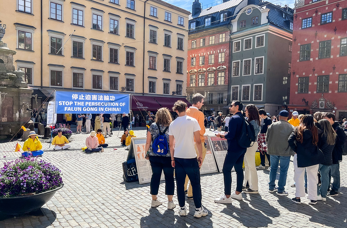 六月初的一个周五下午,在诺贝尔博物馆前,法轮功学员炼功场面祥和,然而,真相展板上曝光的中共迫害法轮功学员,及活摘他们器官的罪行,令过往的游人震惊不已。其中包括一位华人教授。
