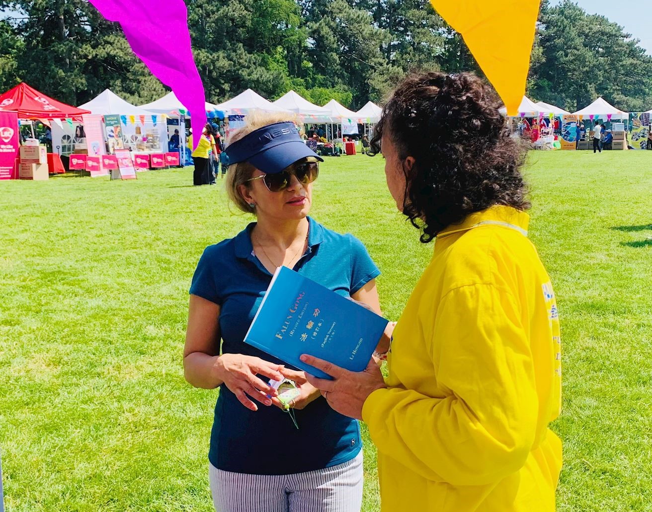 她来到大法展位,在听完学员的介绍后,她对学员说:“我之前参加过的研讨会中,有法轮大法主题的。因此,我比较早就知道在中国大陆,法轮功学员长期遭受着中共的迫害和折磨。可是,我认为法轮功是有益和向善的。现如今,如何保持心理健康是备受关注的热门话题。法轮功教给了学员真、善、忍的做人道理,并且还有打坐和炼功动作。真、善、忍的指导会让人们在生活中受益无穷。”