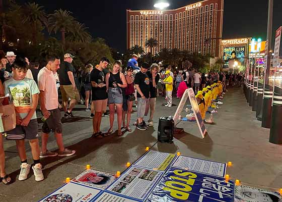 七月九日傍晚,法轮功学员在拉斯维加斯举办“七·二零”系列活动,谴责中共对法轮功长达二十四年的残酷迫害,悼念被中共迫害致死的法轮功学员。