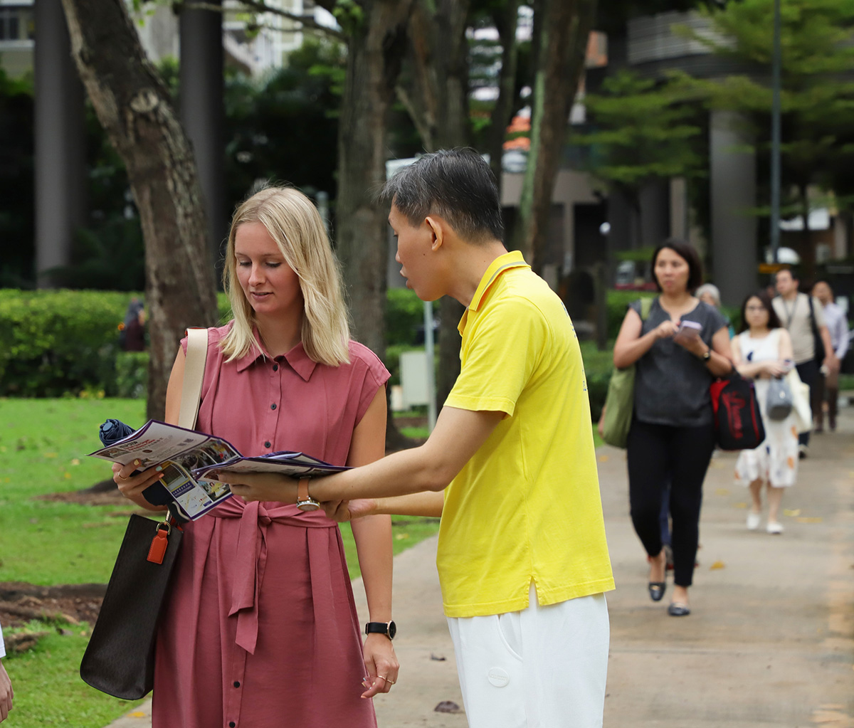 三十岁的新加坡华人伊伊在附近工作,她向学员倾诉已经怀孕,还要工作,压力不小。学员与她分享自己因修炼而学会如何缓解工作压力、改善人际关系的经验,还介绍不少修炼人会带着家里的小朋友学法炼功,小孩子从小听闻“真、善、忍“比较不会受到现时恶劣环境的影响。伊伊听得饶有兴致,也希望从中获益。
