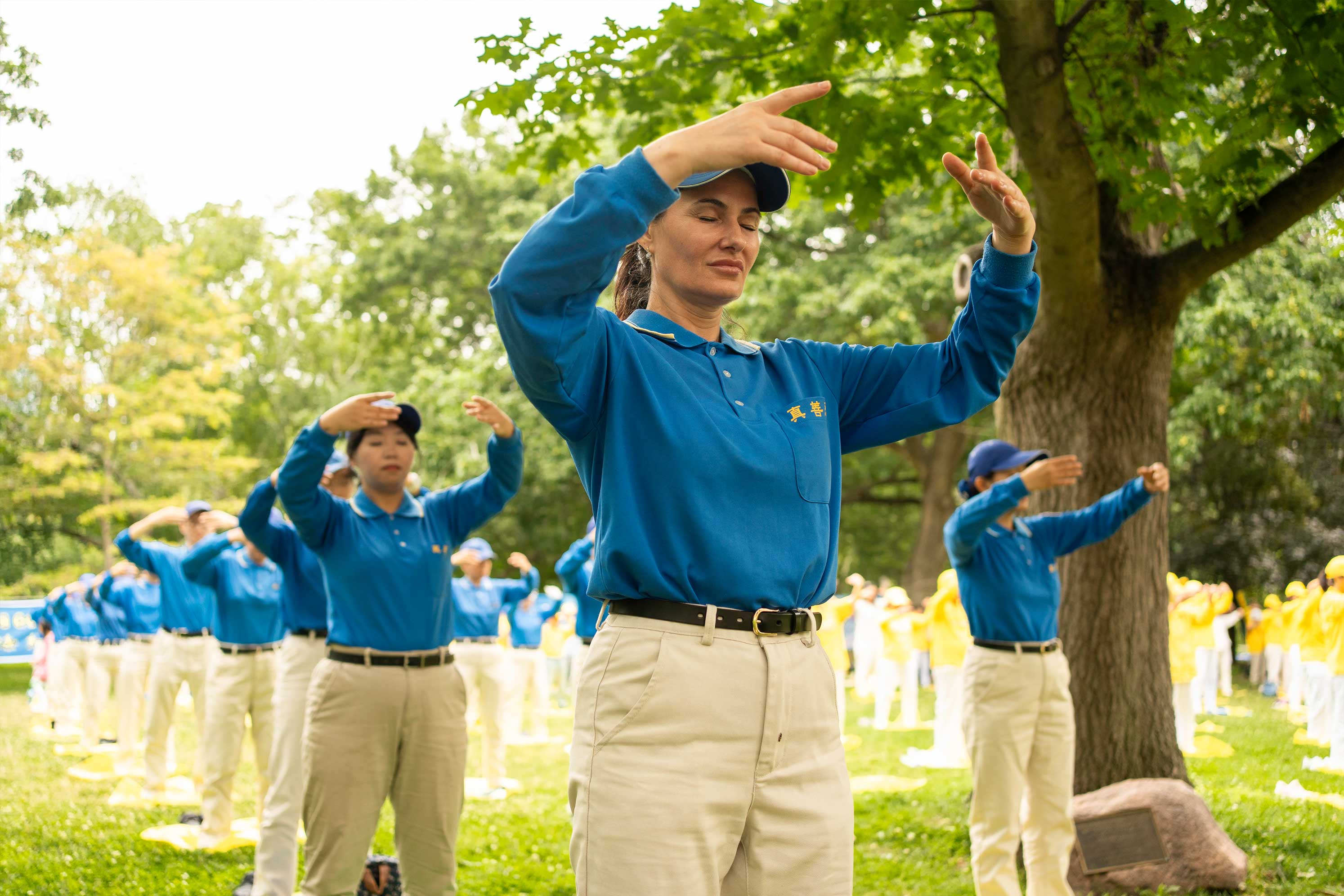 罗斯(Rose)是约旦人,在多伦多担任商科老师。她和先生、女儿一起来到公园,从远处就看到了着装明亮的学员们,走近了才发现他们都在炼功。