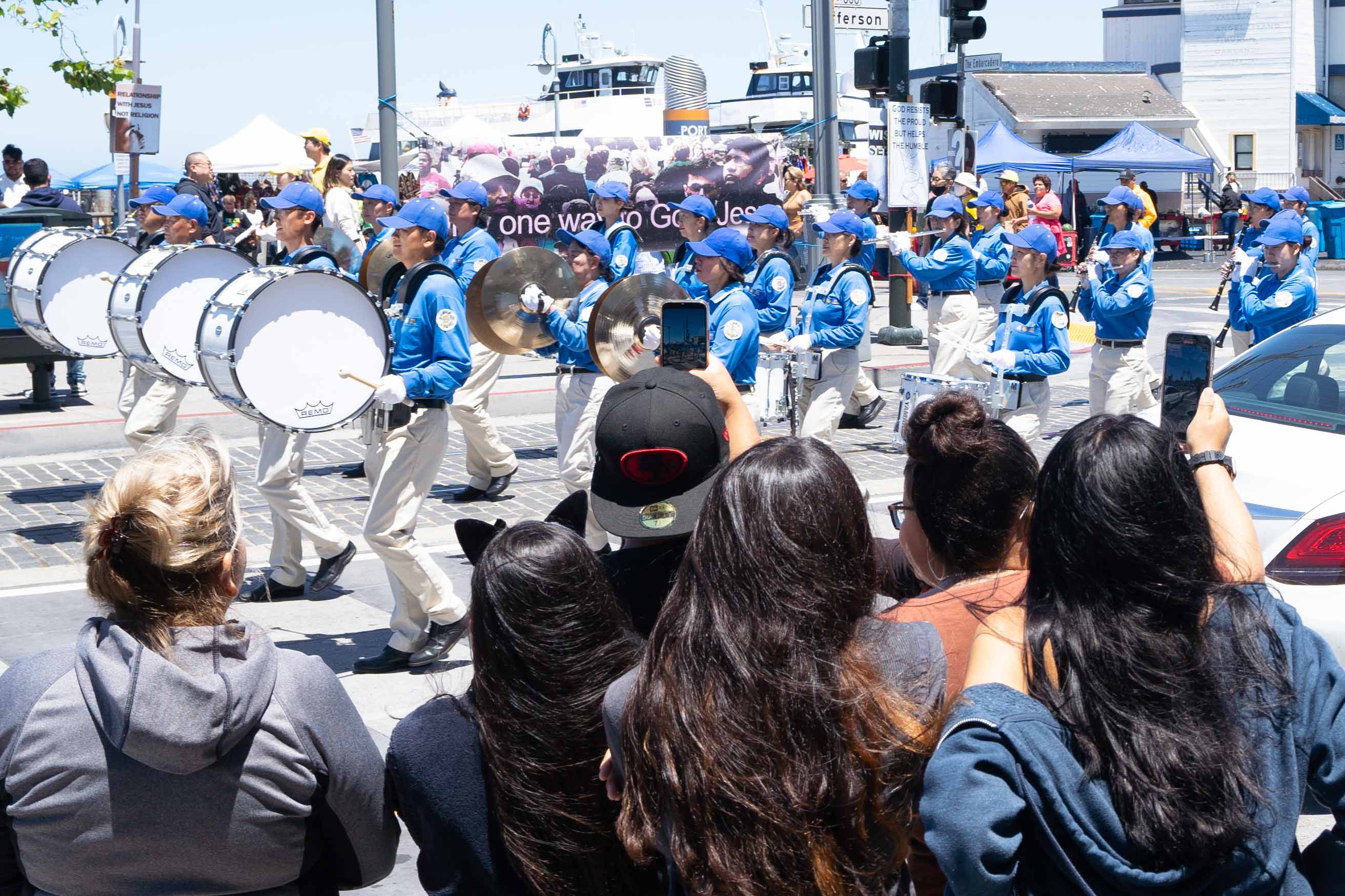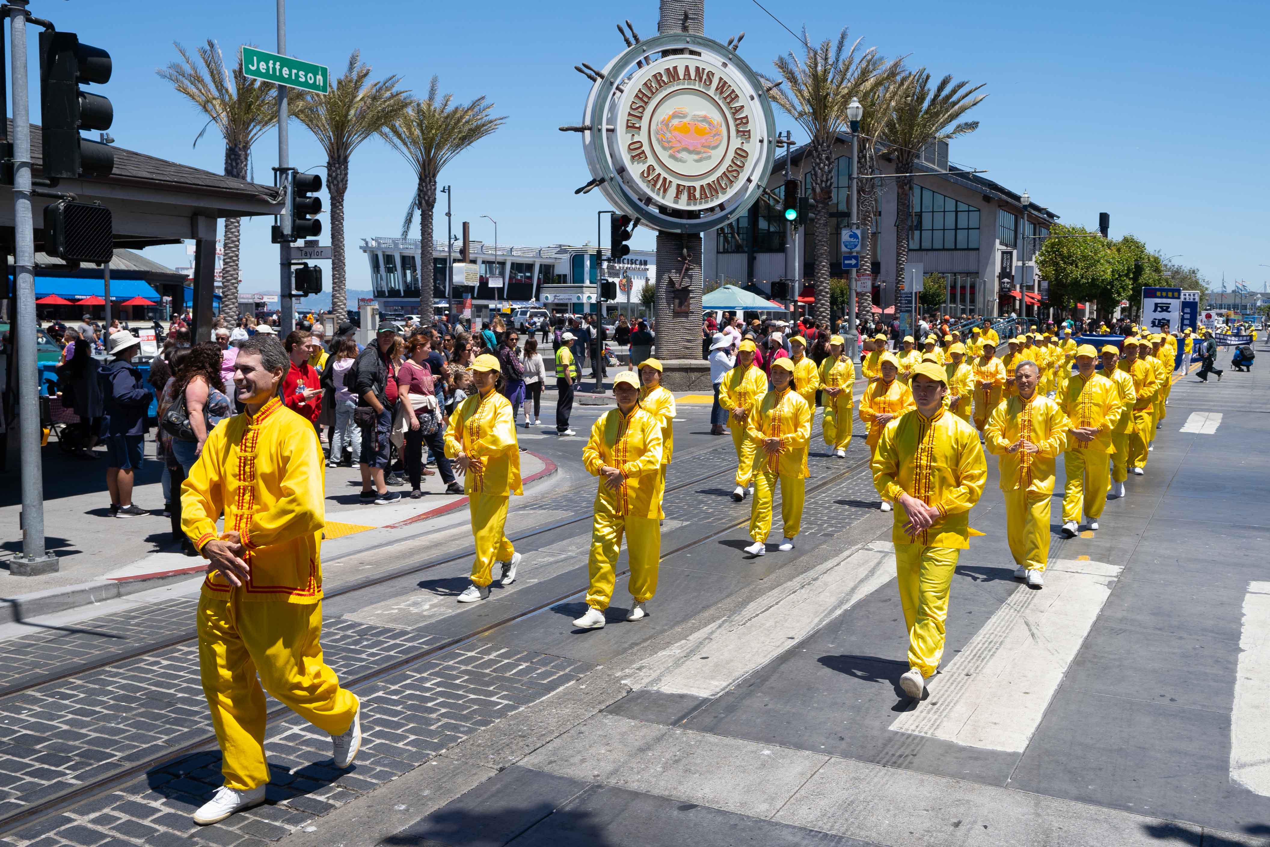 星期六上午八点,法轮功学员首先在旧金山渡轮大厦(Ferry Building)前集体炼功,展示祥和优美的功法。许多游客被吸引,了解什么是法轮功。还有的人看到这么祥和的炼功场面,模仿着学员的动作学炼。