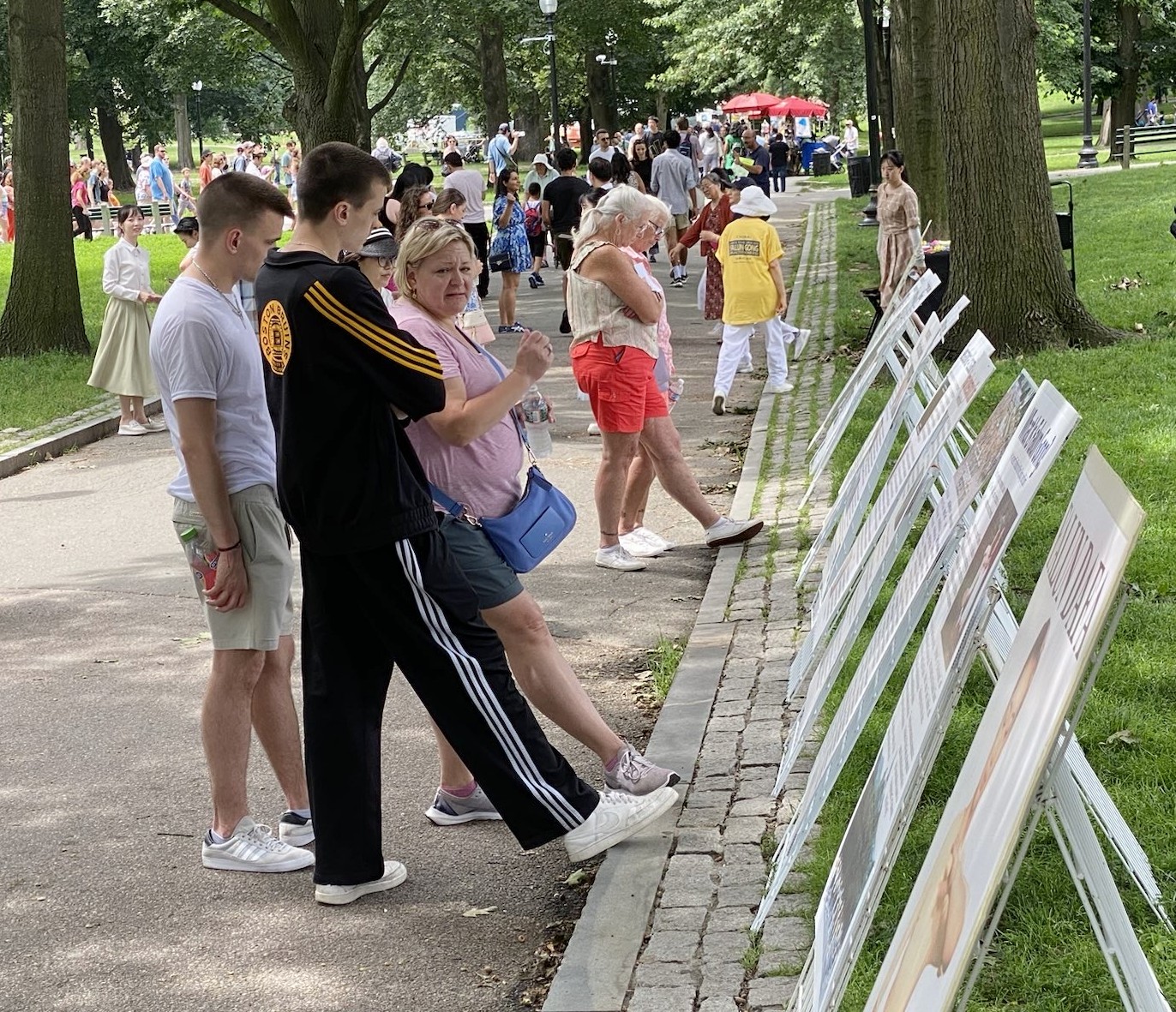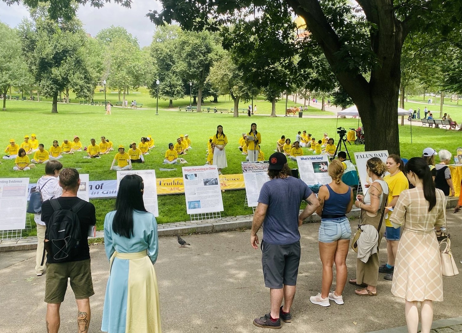 图1:二零二三年七月十五日,波士顿地区法轮功学员在市中心著名的波士顿公园集会炼功,呼吁停止这长达二十四年的暴行。