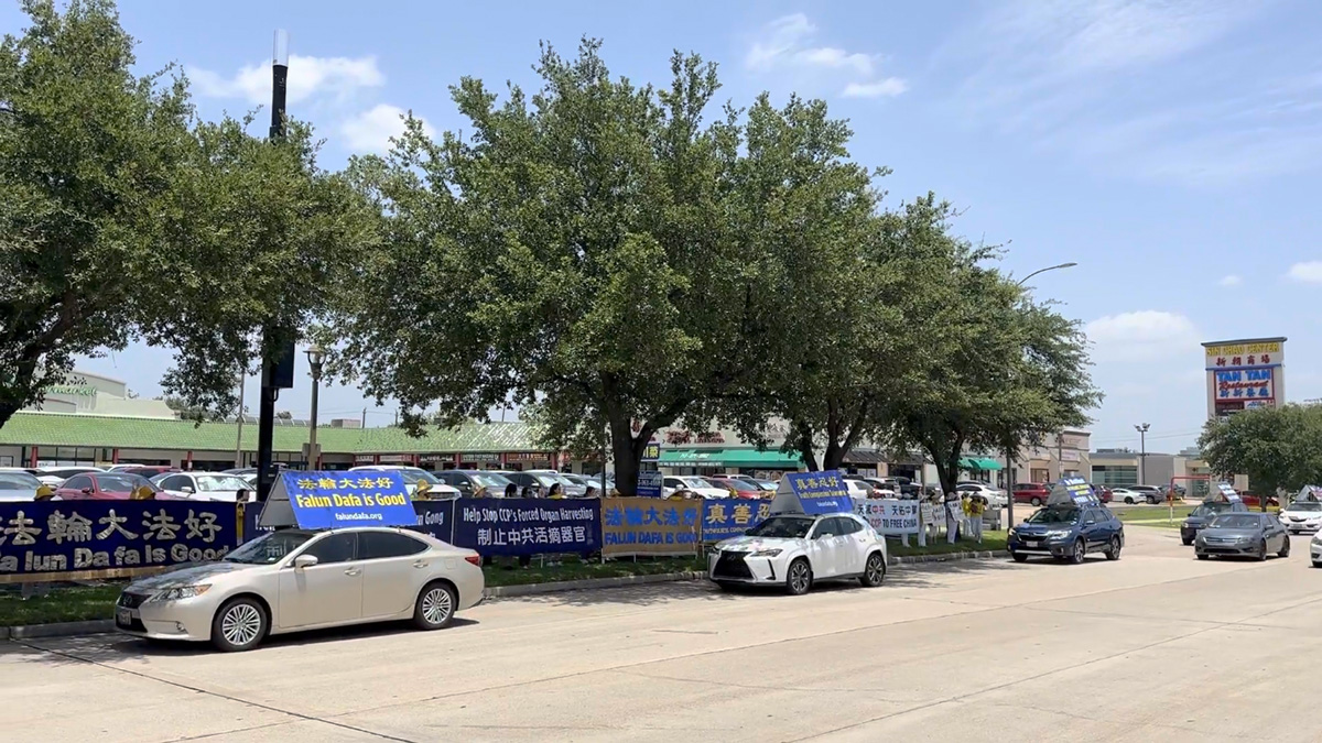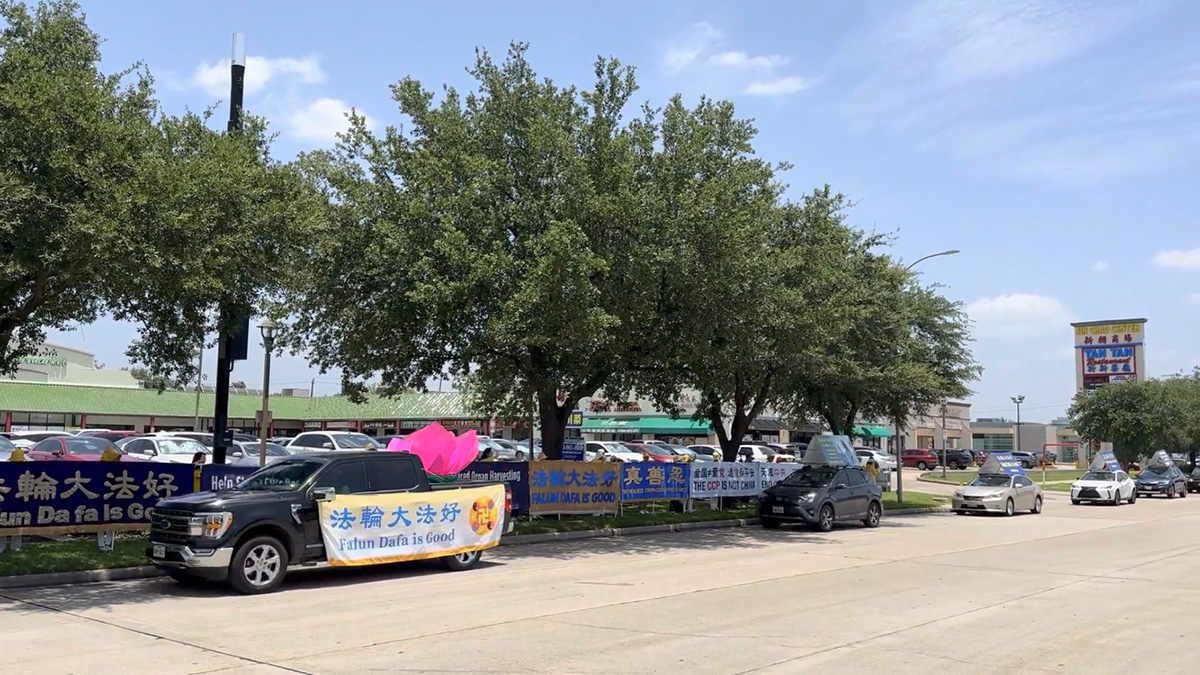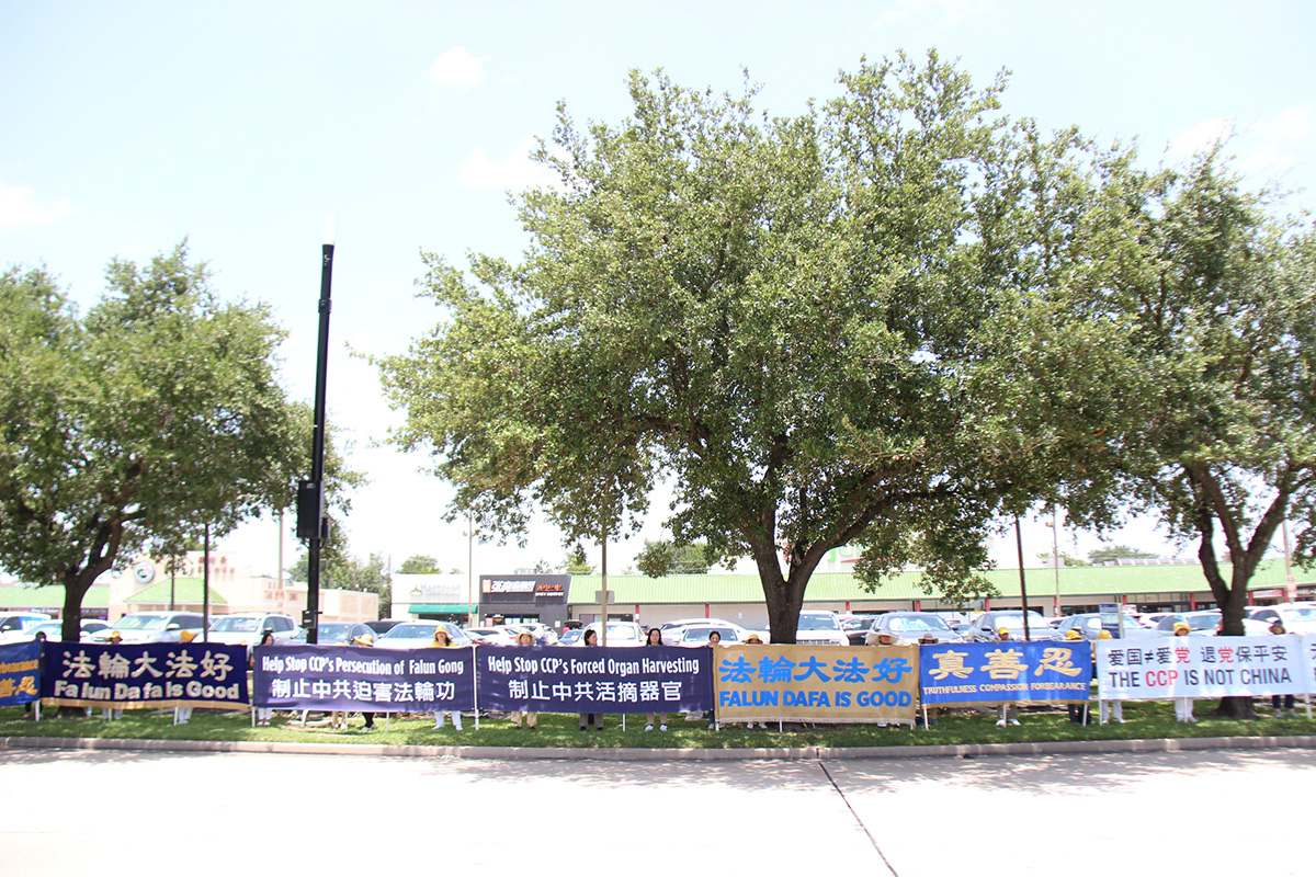 当天休斯顿温度高达华氏一百度,法轮功学员冒着酷暑,沿路展开多面横幅,上面写着“世界需要真善忍”、“法轮大法好”、“制止中共迫害法轮功”、“制止中共活摘器官”、“爱国不等于爱党 退党保平安”等。