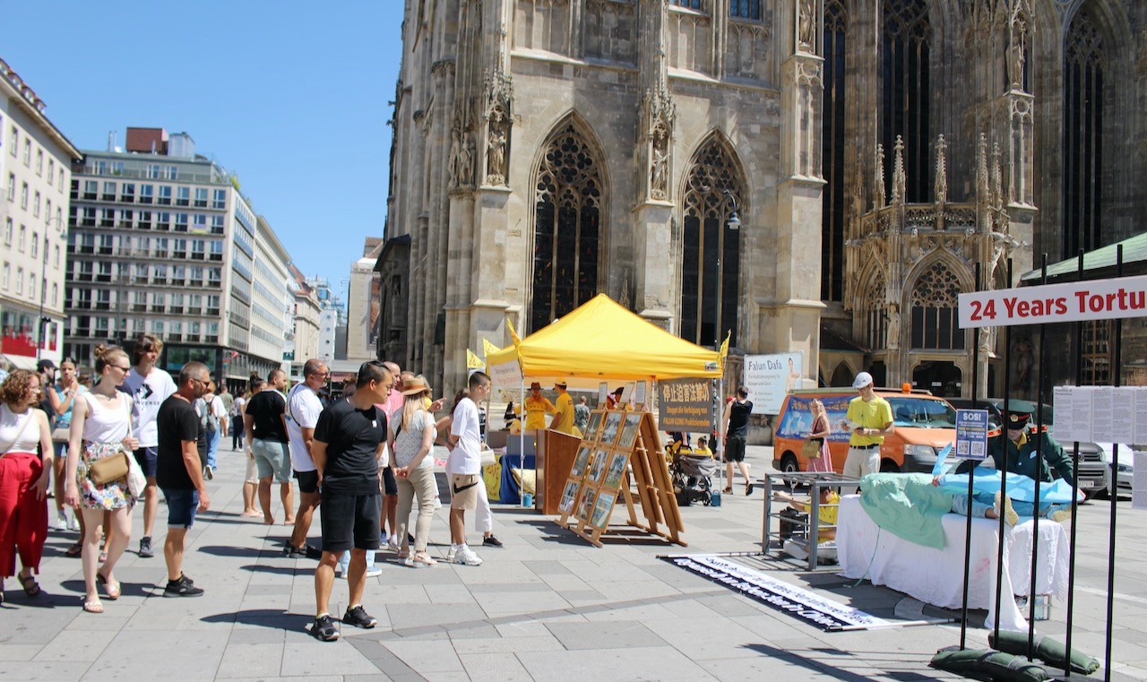 【明慧网二零二三年七月十八日】二零二三年七月十五日,奥地利部分法轮功学员聚集在维也纳斯蒂芬广场(Stephansplatz),揭露中共在过去二十四年对法轮功的残酷迫害,并呼吁停止这场迫害。了解真相的民众纷纷谴责中共的罪行,并为反迫害签名支持。
