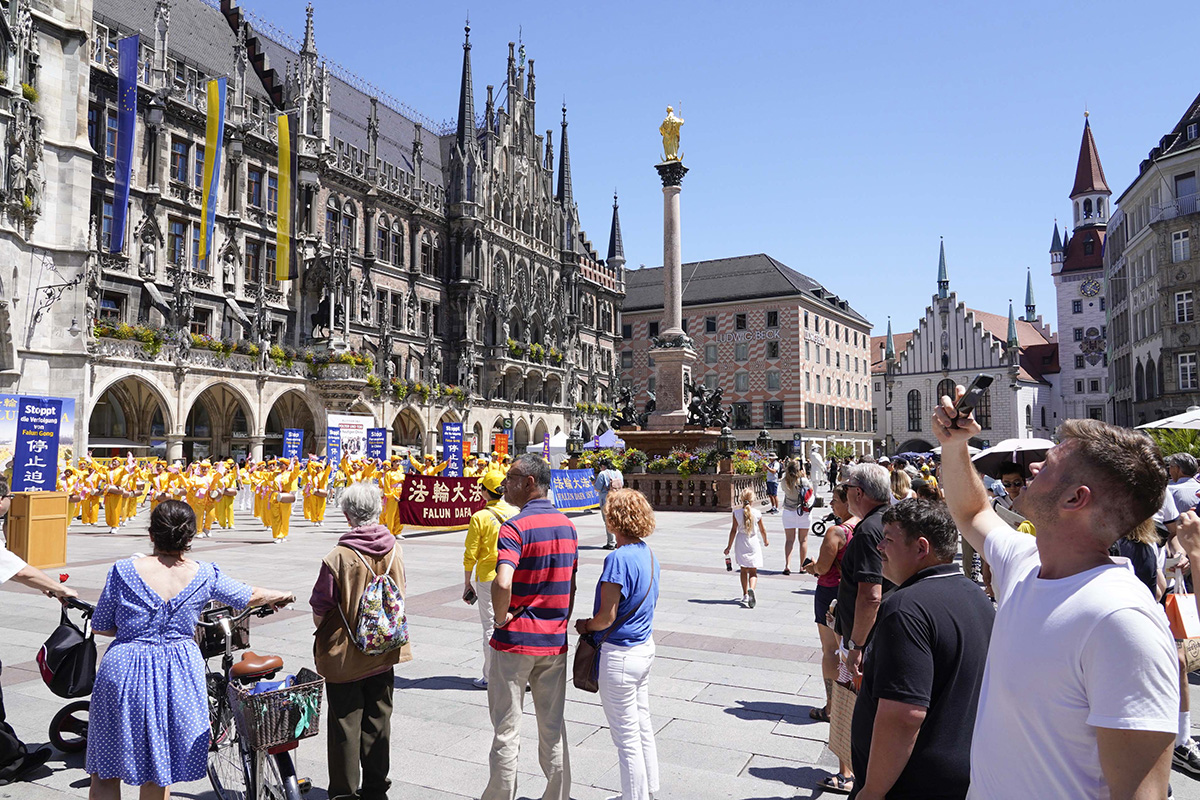图1~2:二零二三年七月十五日,德国法轮功学员在慕尼黑市政府前的玛利亚广场举办集会,纪念法轮功学员反迫害24周年。
