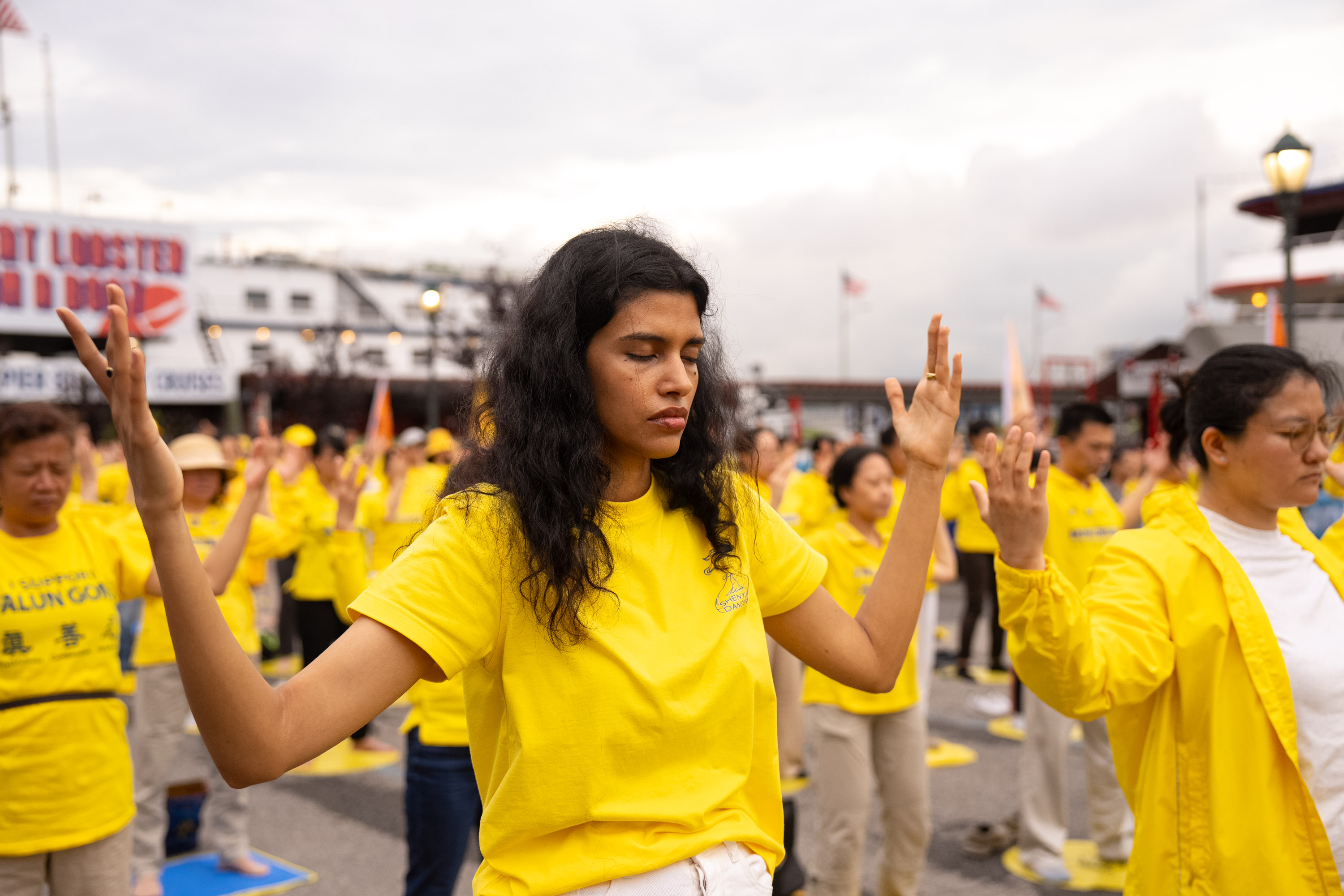 一名华人青年男子站在河边,静静地看着学员炼功。他说,自己前一天在唐人街看到了法轮功学员游行,他经常看新唐人电视台的节目,并说:“我也很想学习法轮功,很想为法轮功学员做些什么。”一位法轮功学员建议他,可以帮助传播真相,也可以上法轮大法网站(falundafa.org)学习法轮功。他诚恳地表示:“我会的。”
