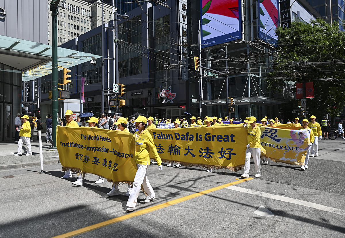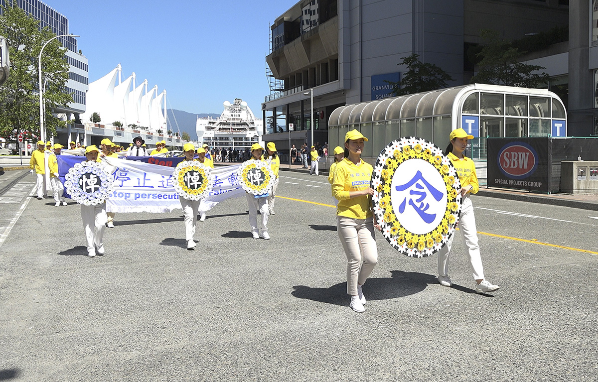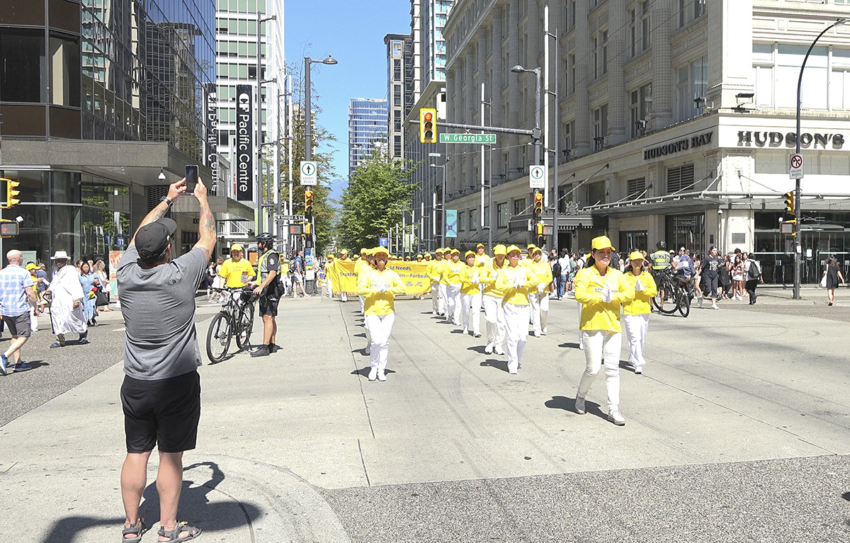 图1~9:二零二三年七月十五日,温哥华法轮功学员在市中心举行反迫害二十四周年纪念活动,观众纷纷拍摄游行队伍。