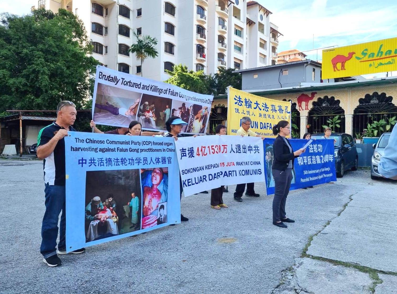七月十五日上午,马来西亚部分法轮功学员来到首都吉隆坡中共驻马大使馆附近举行反迫害集会,揭露中共对法轮功学员的群体灭绝迫害,呼吁各界共同制止中共活摘法轮功学员器官的罪行,同时声援4.15亿中国人退出中共党、团、队组织。