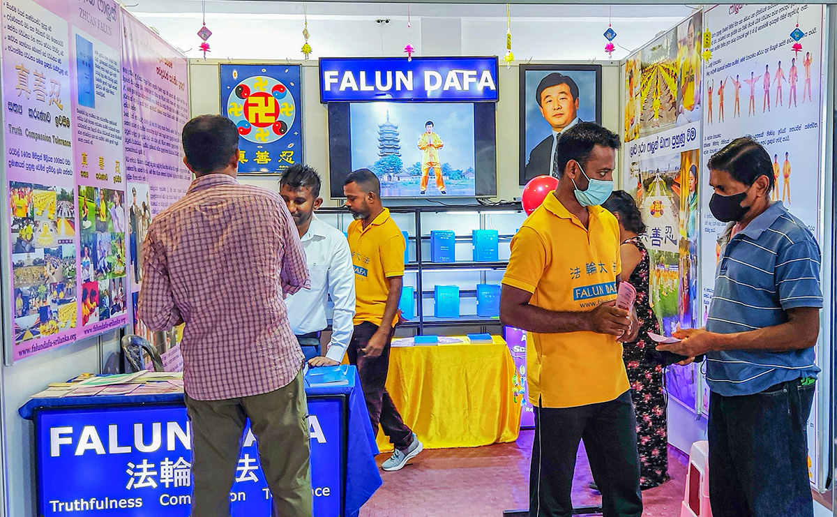 法轮功学员的展位布满了介绍功法的彩色展板。一台大电视机播放李洪志大师教授五套功法的视频,并展示了僧伽罗语、泰米尔语和英语版的法轮大法主要著作《转法轮》