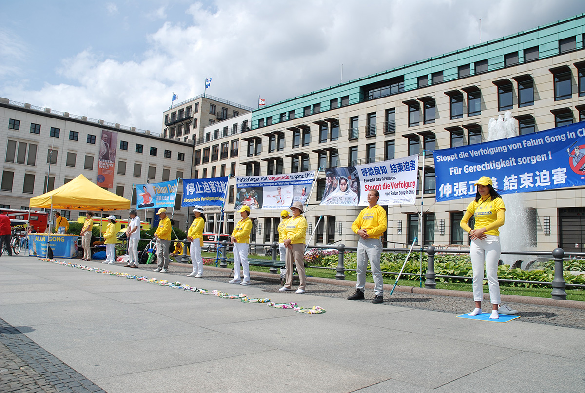 【明慧网二零二三年七月二十三日】(明慧记者雪莉德国报道)二零二三年七月二十二日,柏林部分学员在布兰登堡门前的巴黎广场上举办信息日讲真相活动,揭露中共对法轮功的迫害。学员们布置展位,打起横幅,在悠扬的音乐声中演示功法。