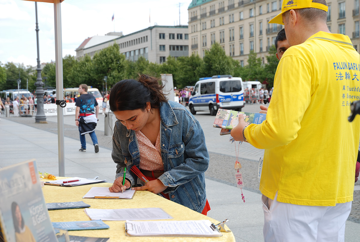 一对来自德国北威州的老夫妇听说学员在这里反对中共的迫害时,马上在请愿书上签名。老先生名叫冈特(Günter),说他希望法轮功学员能够收集到很多的签名,可以(让各国)在议会里讨论如何在政府层面上抵制迫害,让事情发生改变。
