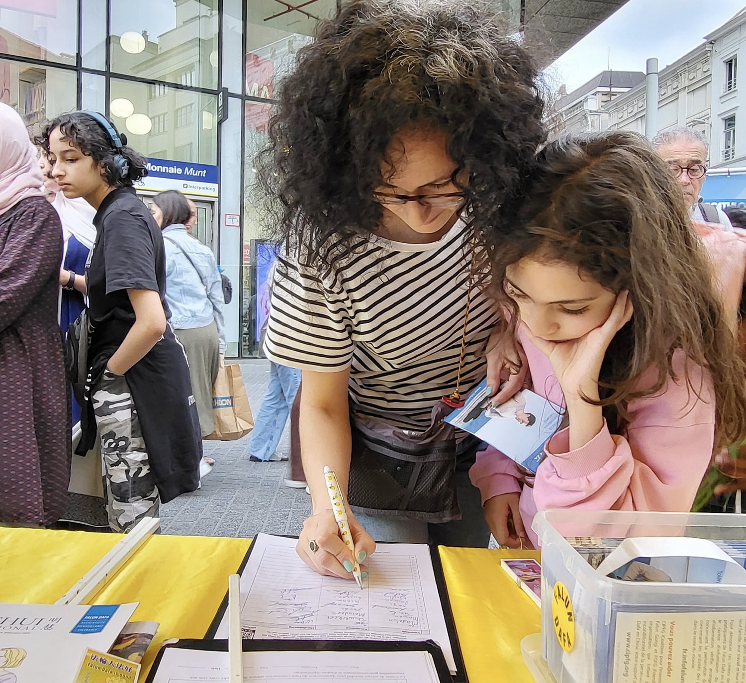 在警察局做职员工作的曼农·迈德斯(Manon Maeinders)和朋友从荷兰到布鲁塞尔度周末,她们来到展桌前与学员交谈后,并签名支持反活摘器官。她很早就了解中共迫害、活摘法轮功学员器官的事情,对此她说:“我有一颗善良的心,要阻止这一切,因为它(这场迫害)反人类是邪恶的。”