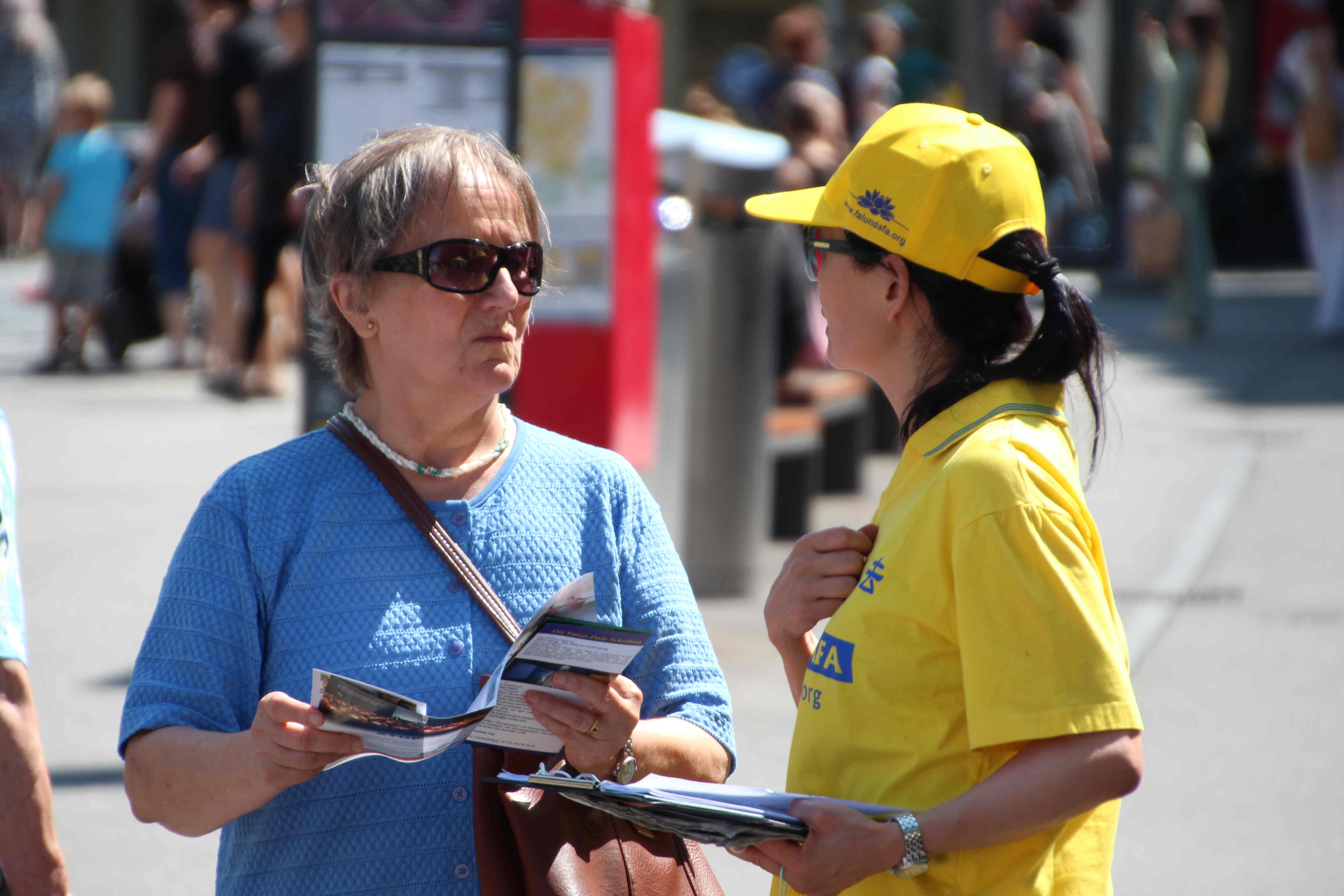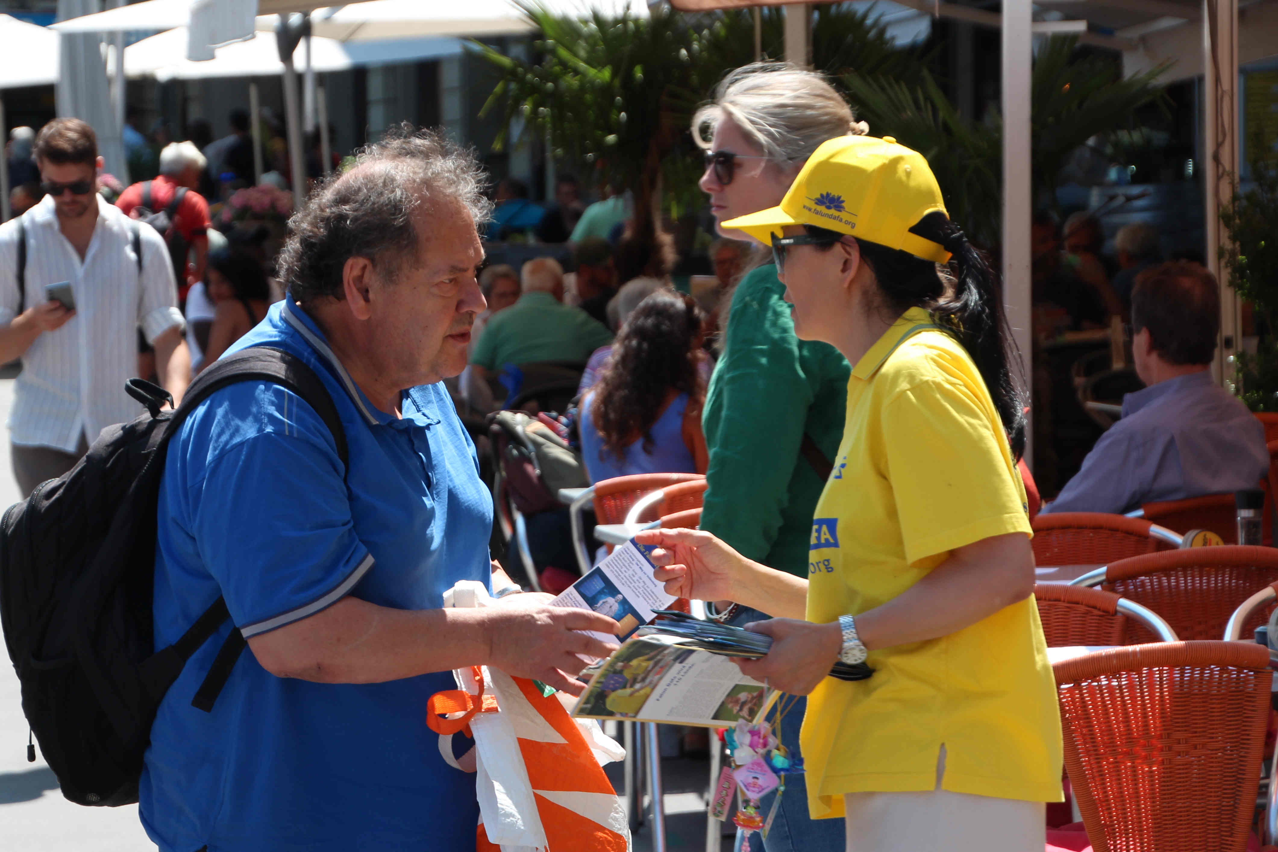 同样是在咖啡店室外座享用美食的皮耶丽娜·雷米(Pierina Raemy)和她的朋友,看着学员们平静地做着舒展的动作,聆听着学员们播放的演讲后,她们主动过来向发送资料的学员询问征签表。仔细阅读后,她们签上了自己的名字,并继续阅读得到的法轮功资料。