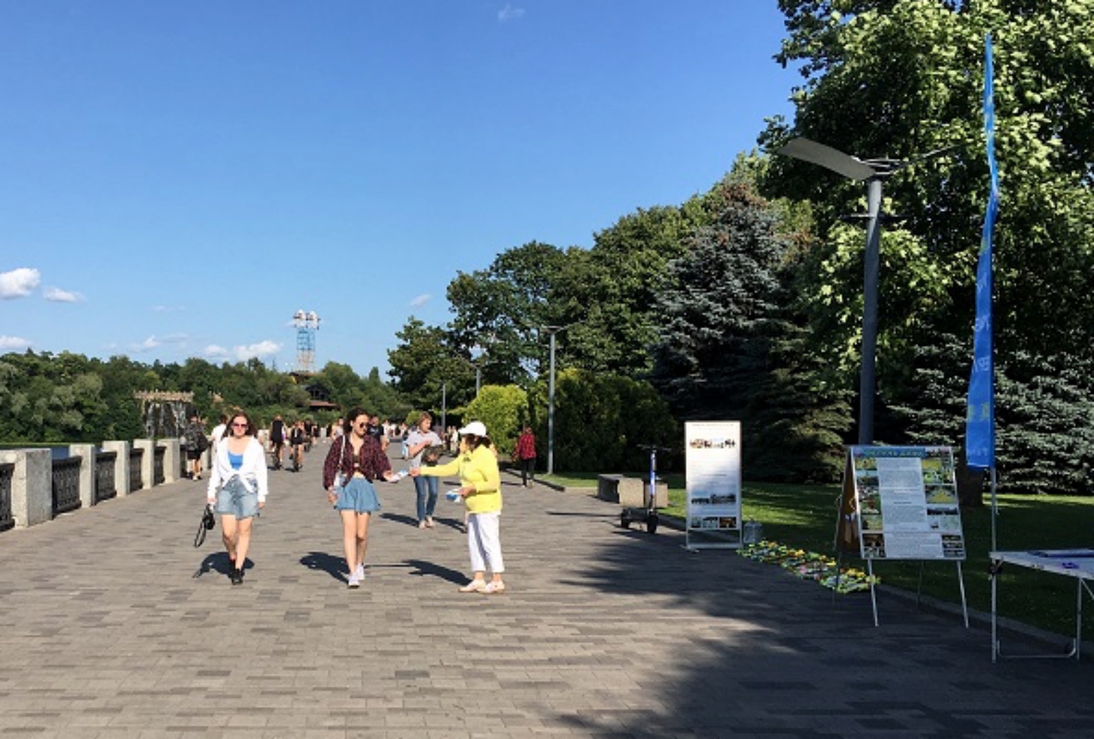 图1~2:二零二三年七月十六日,法轮功学员在第聂伯罗河堤上集体炼功,向人们介绍法轮功。