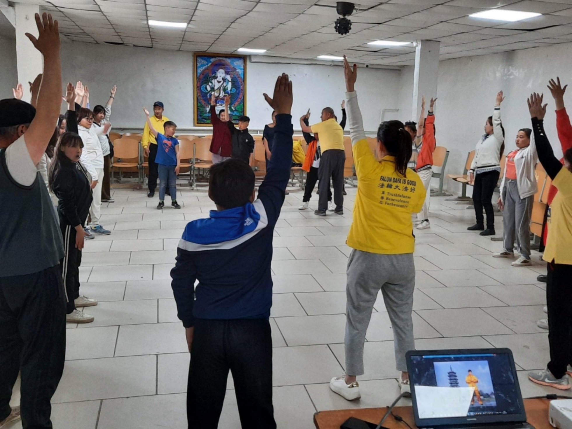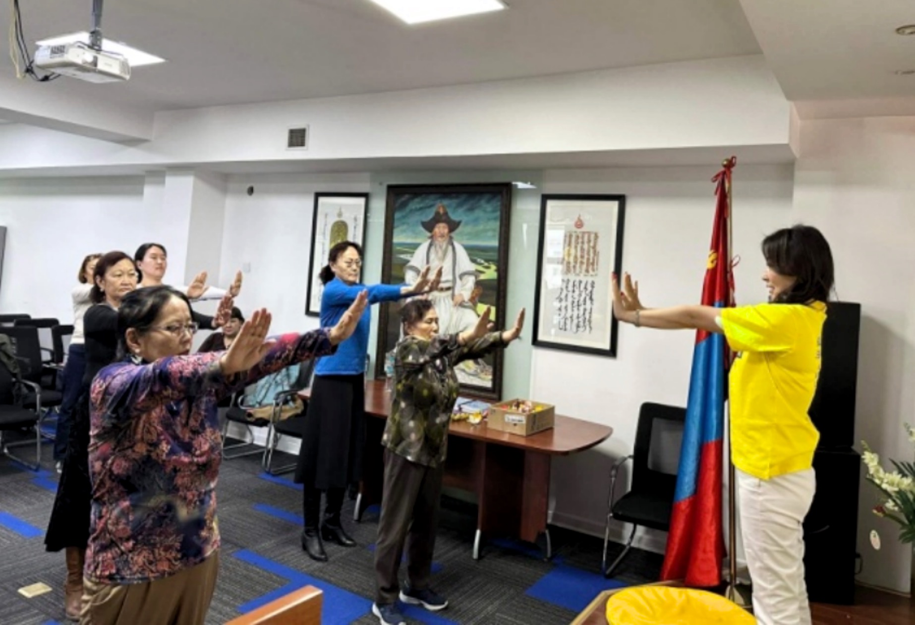 图1:法轮功学员在乌兰巴托双子塔会议中心介绍法轮大法,有缘人学炼法轮功。