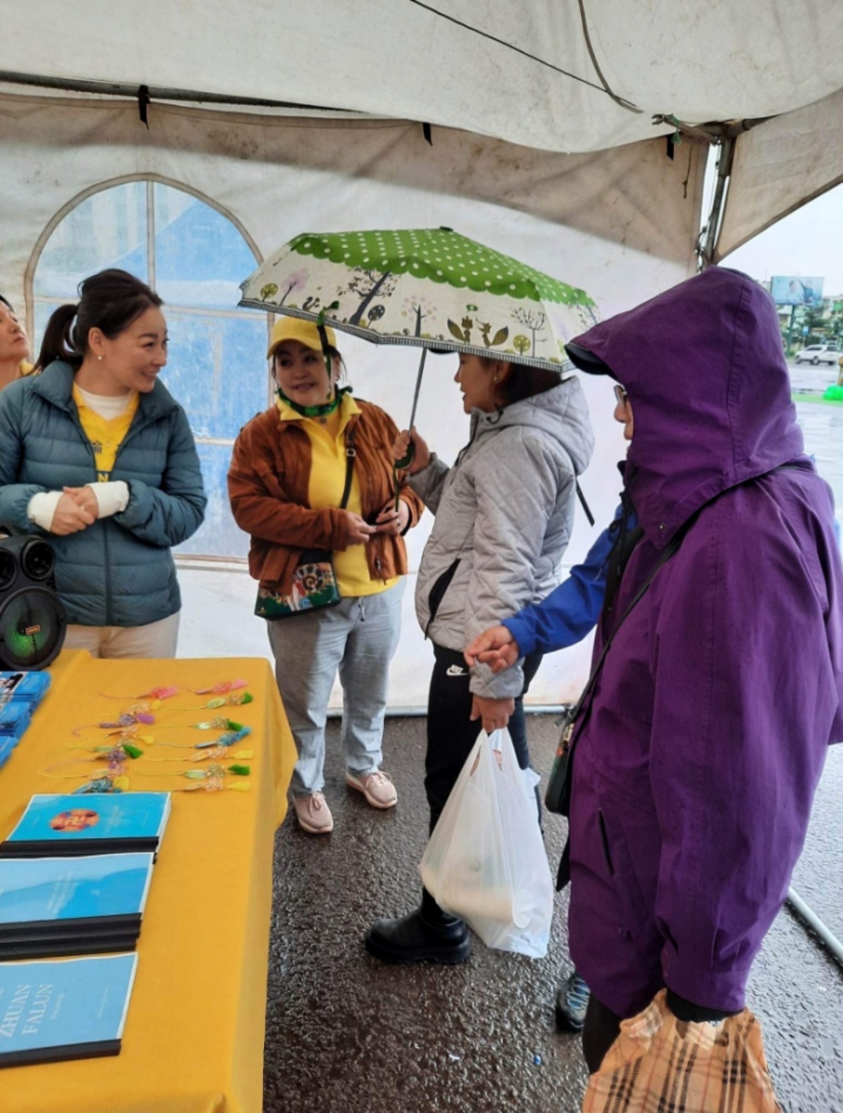 图3:法轮功学员在额尔登特市设立展位传播法轮功的真相。人们冒雨来了解大法真相。