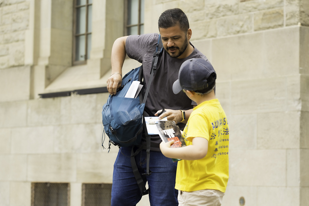 雷内(Rene)是法国人,来加拿大蒙特利尔读书。他带父母来多伦多游玩,正好看到了法轮功学员在市中心的街道上举办横幅展。