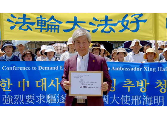 七月二十八日,韩国法轮大法佛学会在韩国总统府前举行新闻发布会,就中共大使馆干扰神韵演出事件,向总统府递交了请愿书。