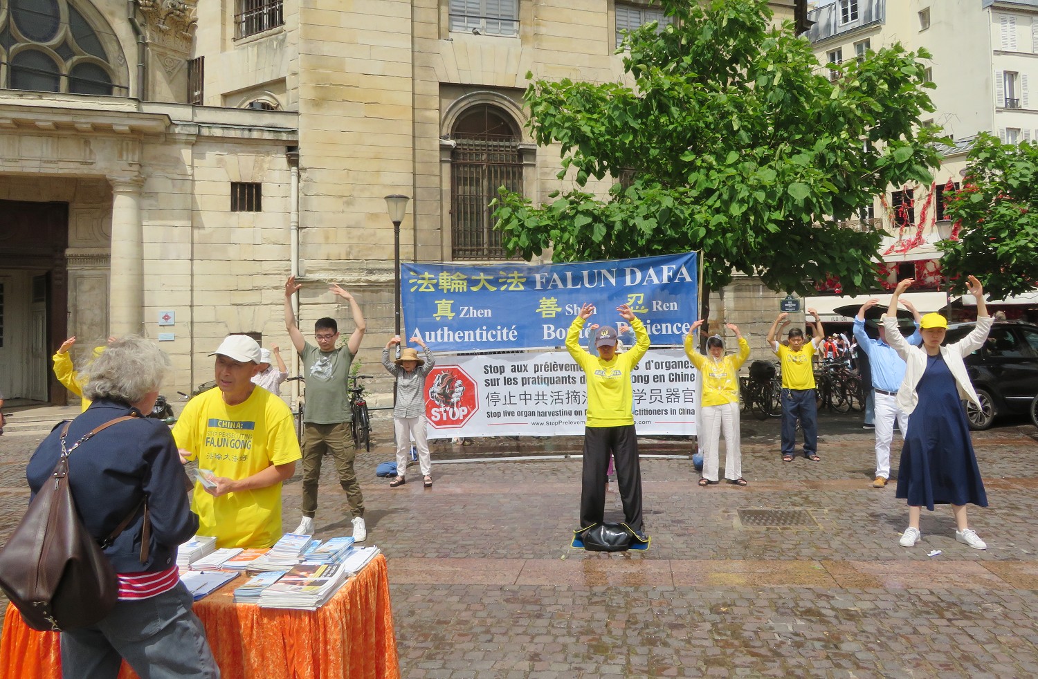 图3:七月二日下午,法轮功学员在巴黎蒙巴纳斯火车站旁的拉乌尔-道特里广场(Place Raoul Dautry)学员们演示法轮功五套功法,向人们介绍法轮功及真相,揭露中共迫害。