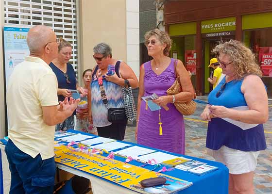 七月二十九日,西班牙法轮功学员在卡塔赫纳市中心的圣塞巴斯蒂安广场向当地民众和游客介绍法轮大法,并揭露中共对法轮功的迫害。