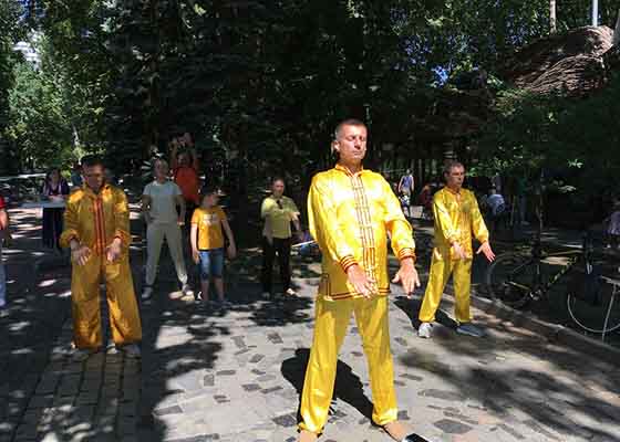 八月五日,乌克兰部份法轮功学员参加了在第聂伯罗市举办的中国体操健康节,该活动展示了许多亚洲的养生和健身方法。