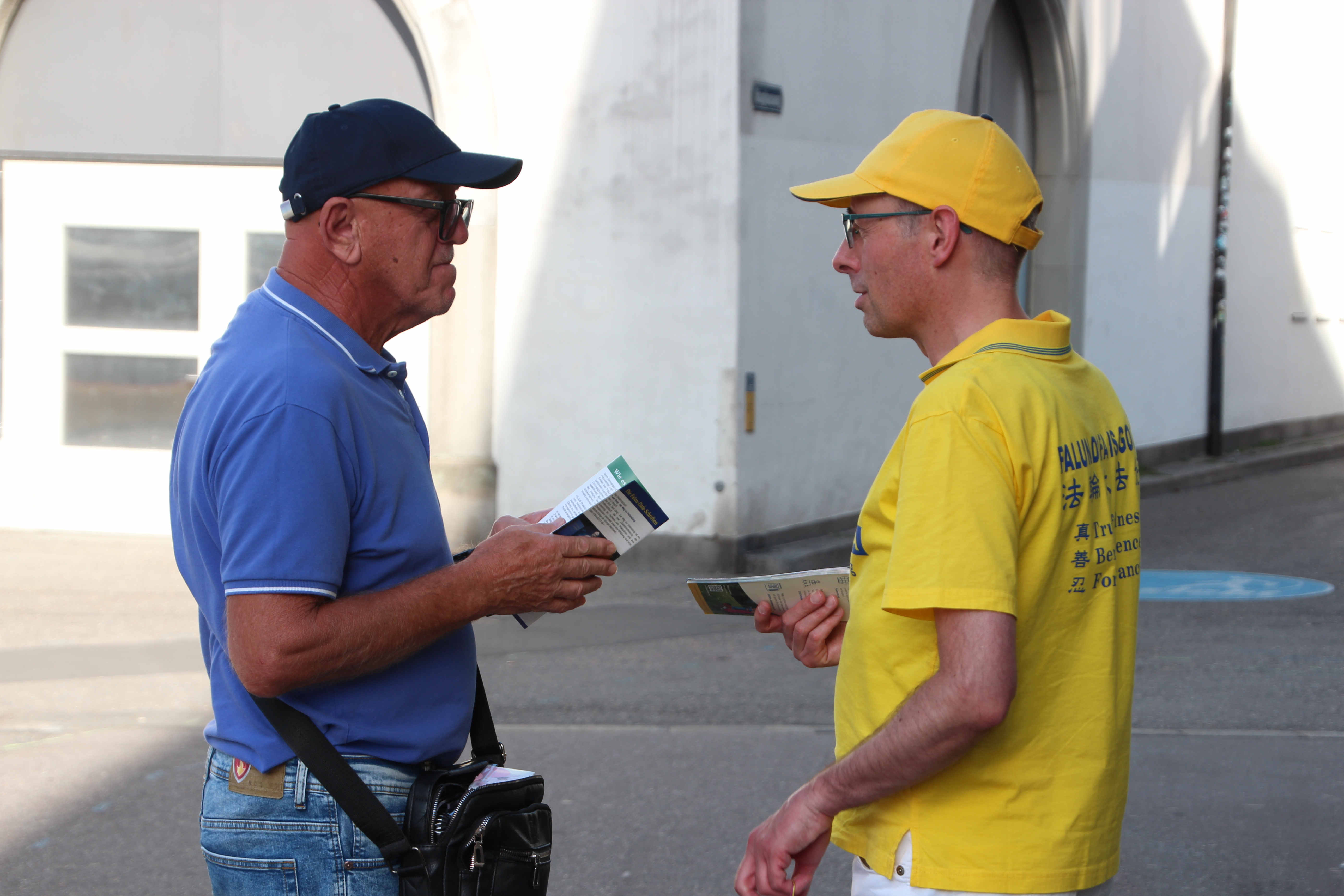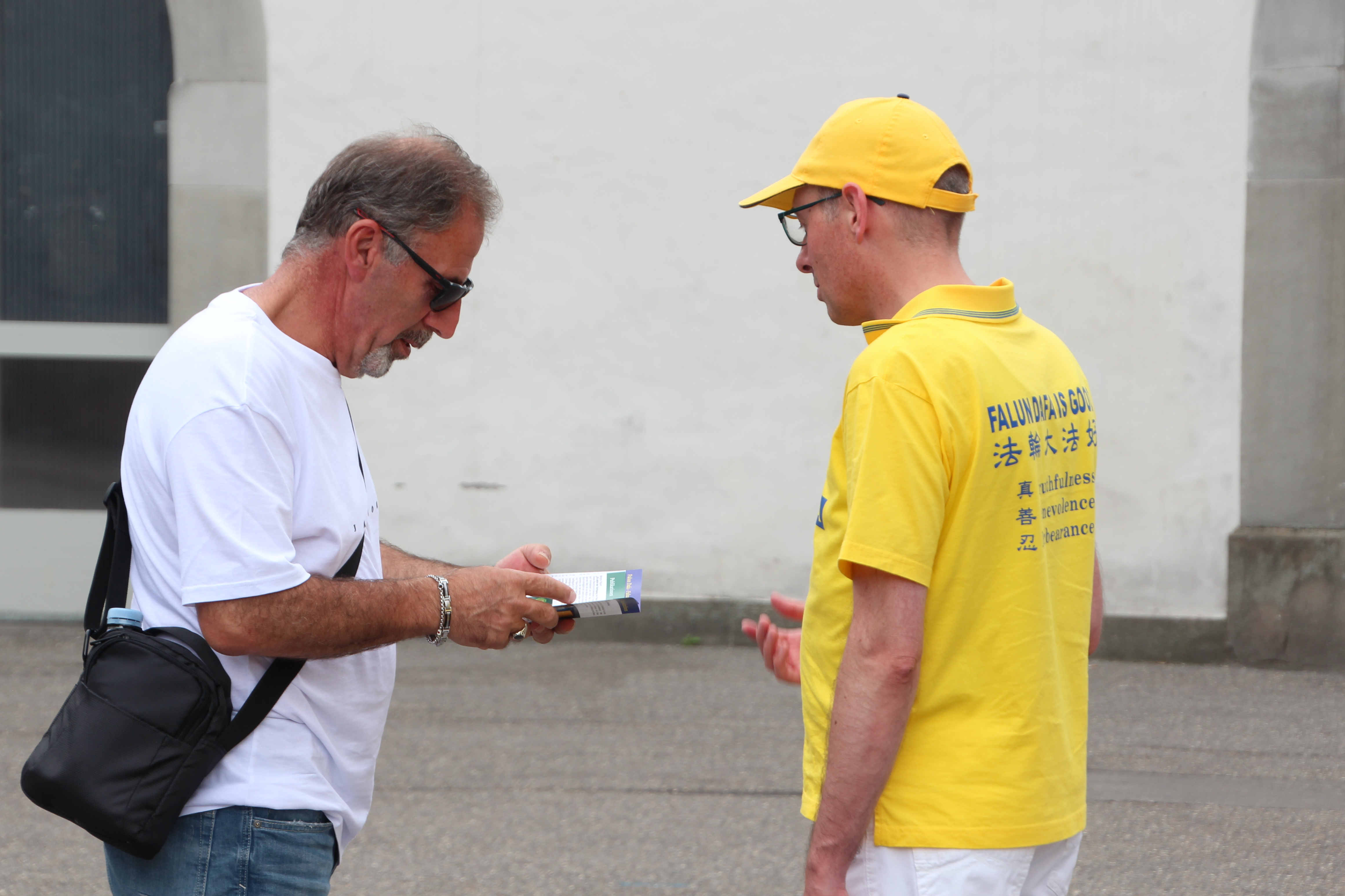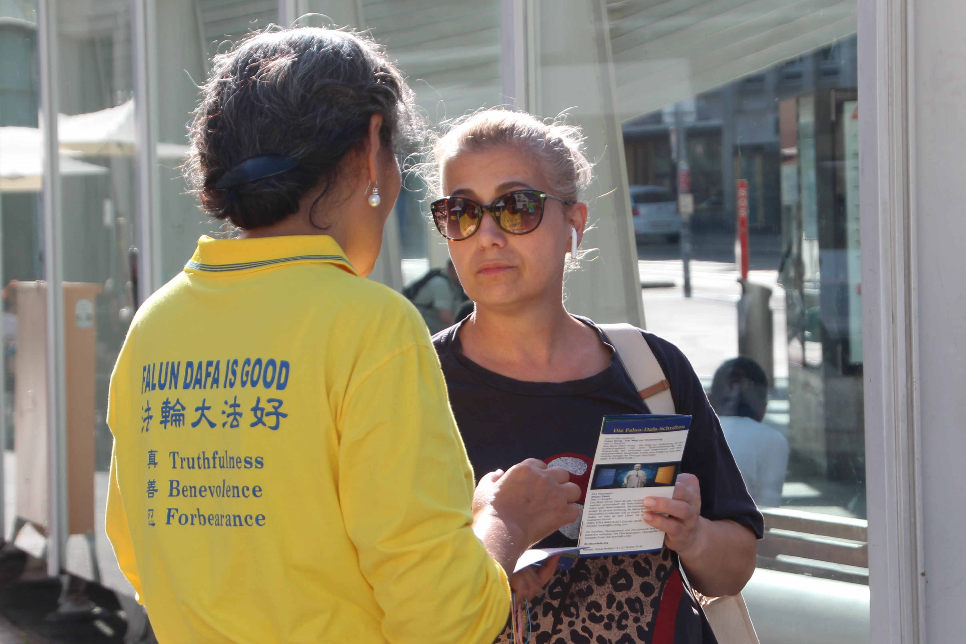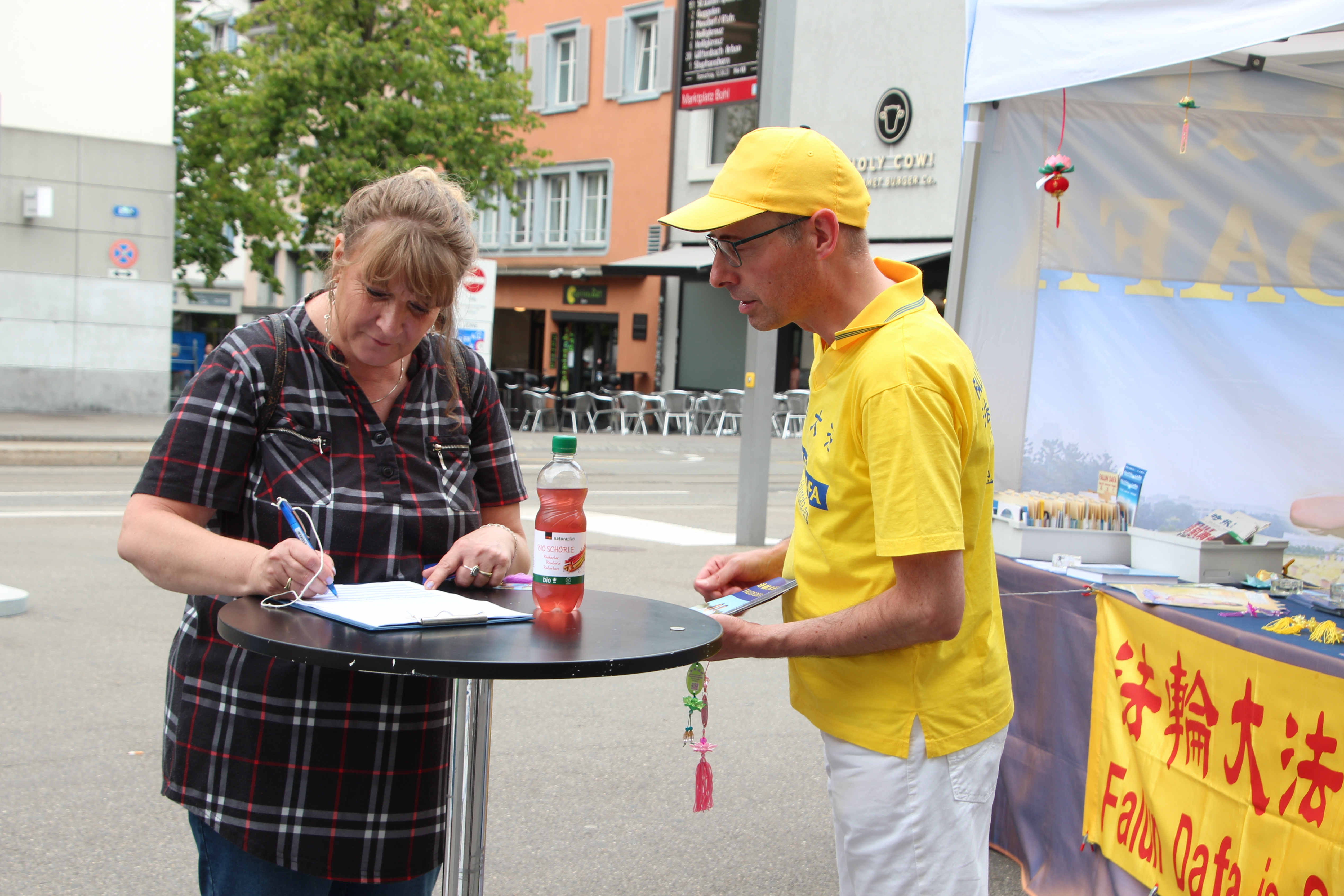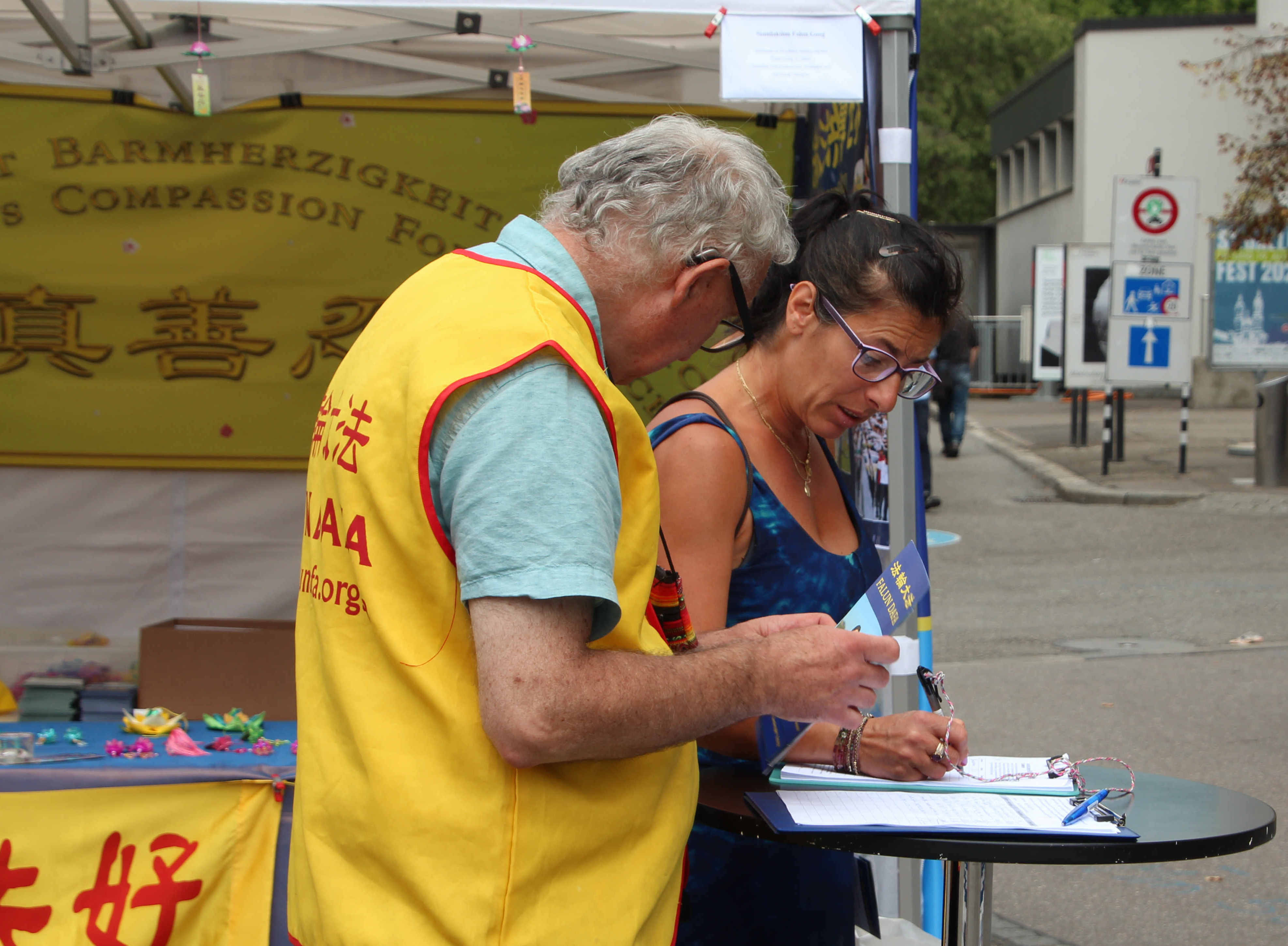 【明慧网二零二三年八月二十日】(明慧记者高思羽瑞士采访报道)远远的看到金色的横幅上有英文的“法轮大法好”的字样,音乐教师玛丽亚(Maria)快走了几步,来到分发资料的法轮功学员前,询问哪里可以签名支持。随后,她放下手中物品,拿起签名表仔细阅读。