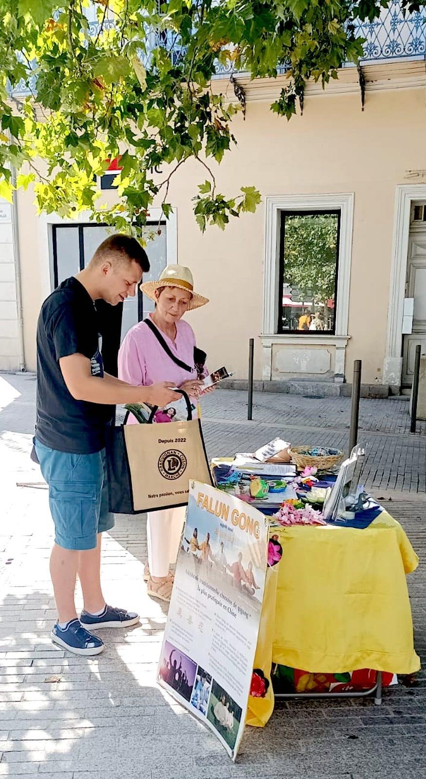 同一天,在法国南部普罗旺斯-阿尔卑斯-蓝色海岸瓦尔省的德拉吉尼昂市,法轮功学员举办了法轮功信息日活动,向人们介绍法轮功,以及自一九九九年以来法轮功学员在中国遭受残酷暴力迫害。