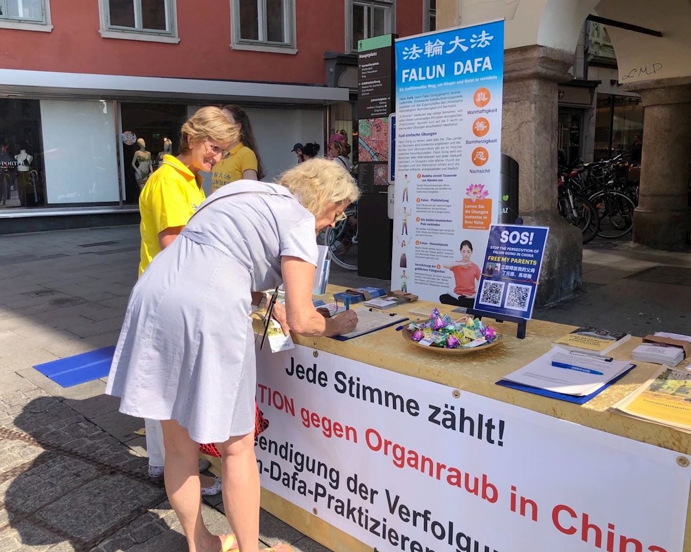 一位住在奥地利的年轻华裔女士来到信息点。她告诉学员,自己的家人由于害怕,不敢接触法轮功。现在她想亲自了解。当学员用中文和德语告诉她真相时,她听得非常认真。最后她说:“每个人都应该有信仰自由”,并为反迫害签了名。临走时,她还为亲人拿了法轮大法的中文真相传单和《九评共产党》一书。