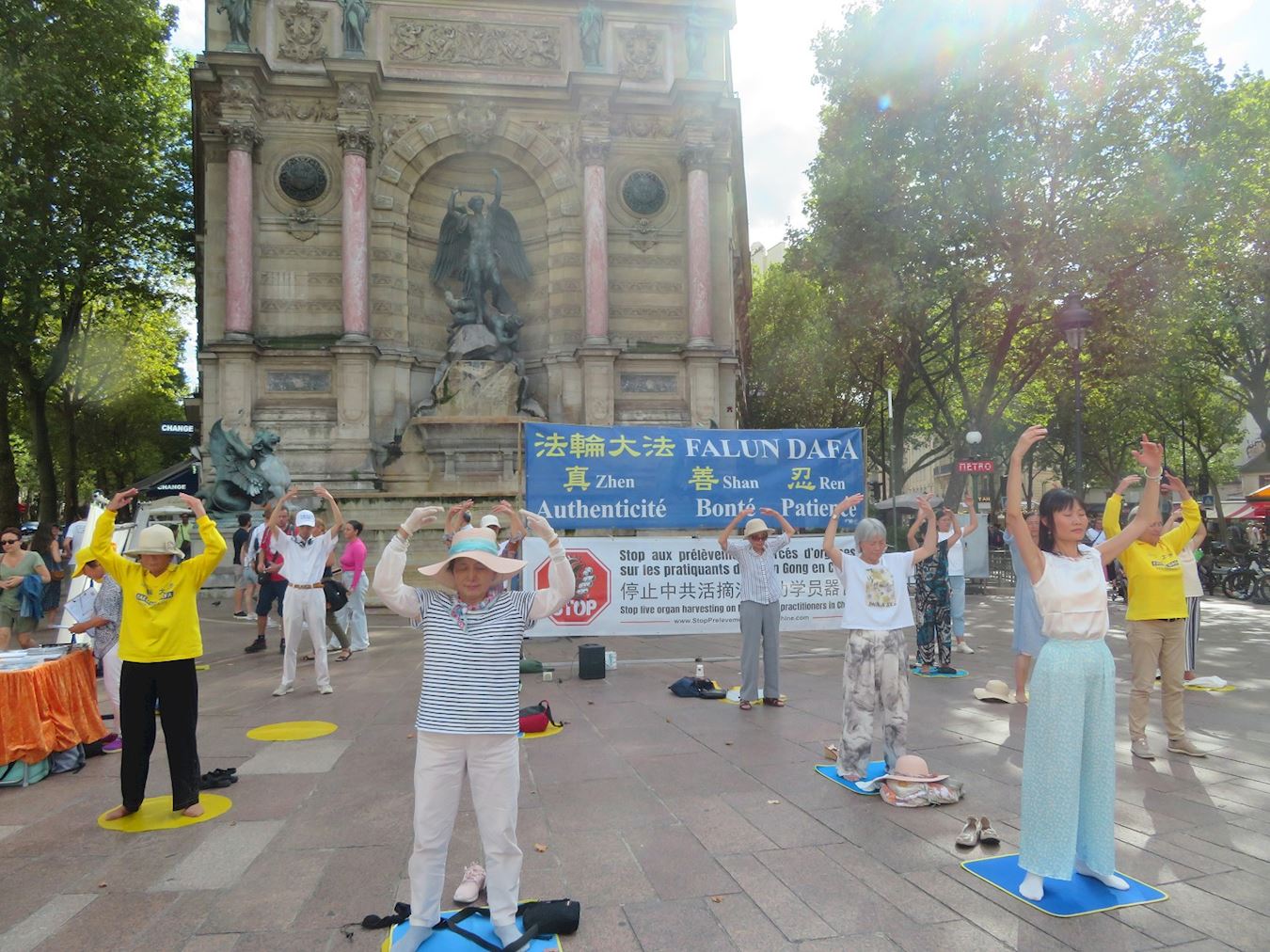 '图1~2:二零二三年八月二十日星期六,法轮功学员在巴黎圣米歇尔广场向民众进行演示功法。'