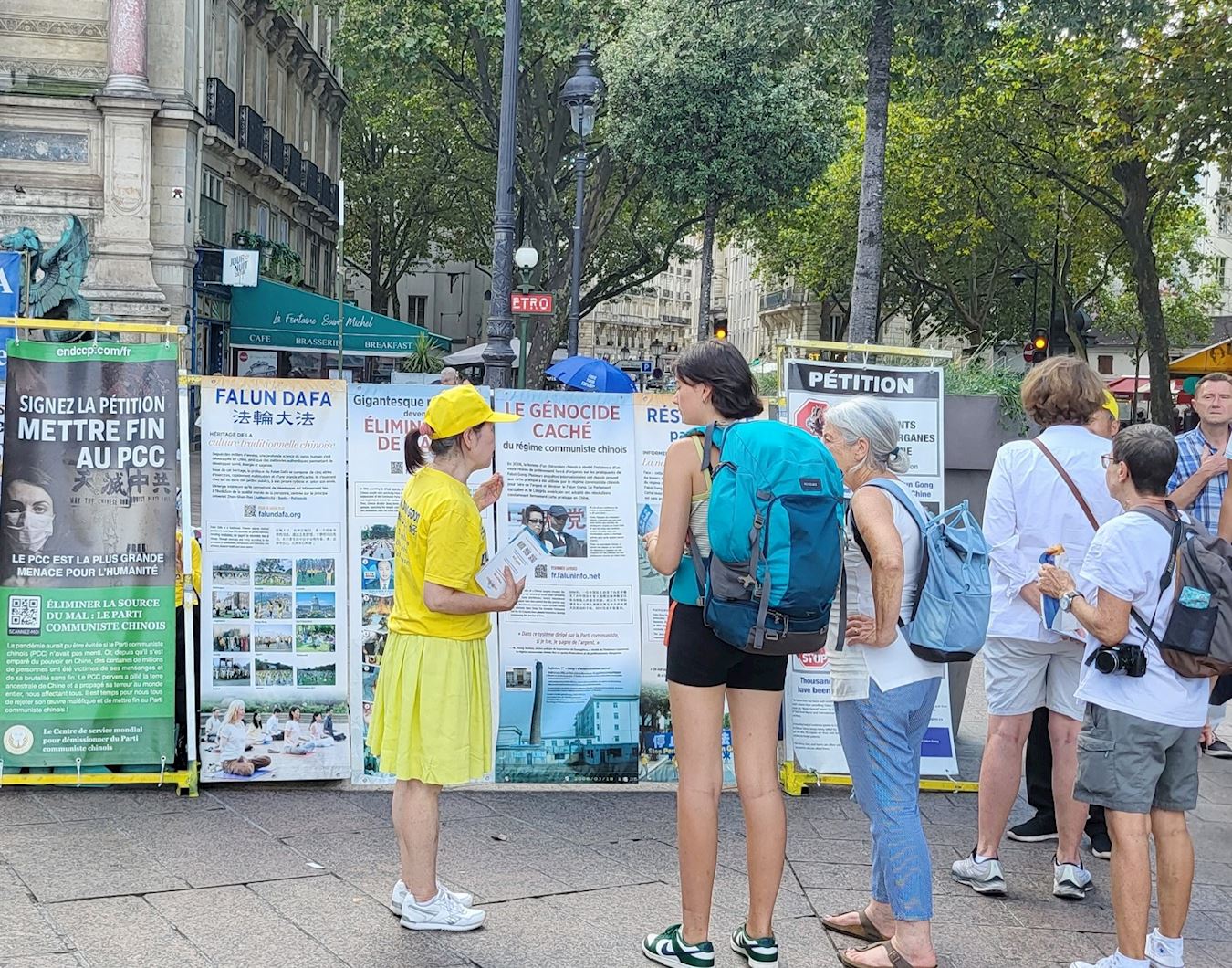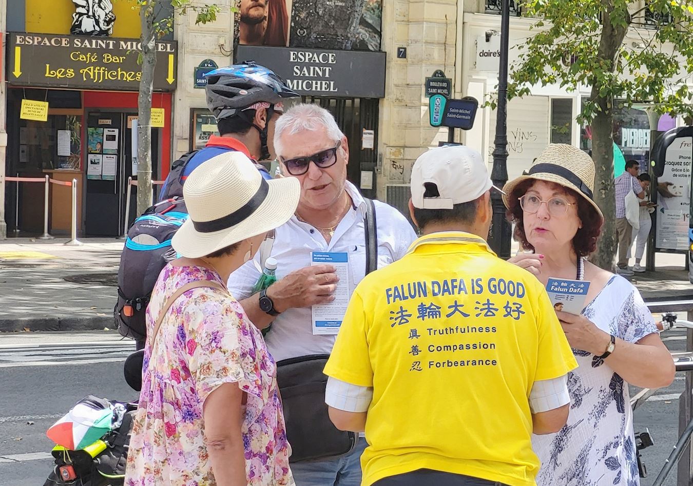 【明慧网二零二三年八月二十四日】(明慧记者周文英巴黎报道)二零二三年八月二十日,法轮功学员再次来到巴黎的圣米歇尔广场,向市民及游客展示法轮功法、讲真相、征集签名,场面祥和。他们的活动吸引了民众的目光。了解迫害真相的游客签名后询问:“我还能为你们做点什么?”还有人说:“共产党是世界的毒瘤,要彻底清除!”