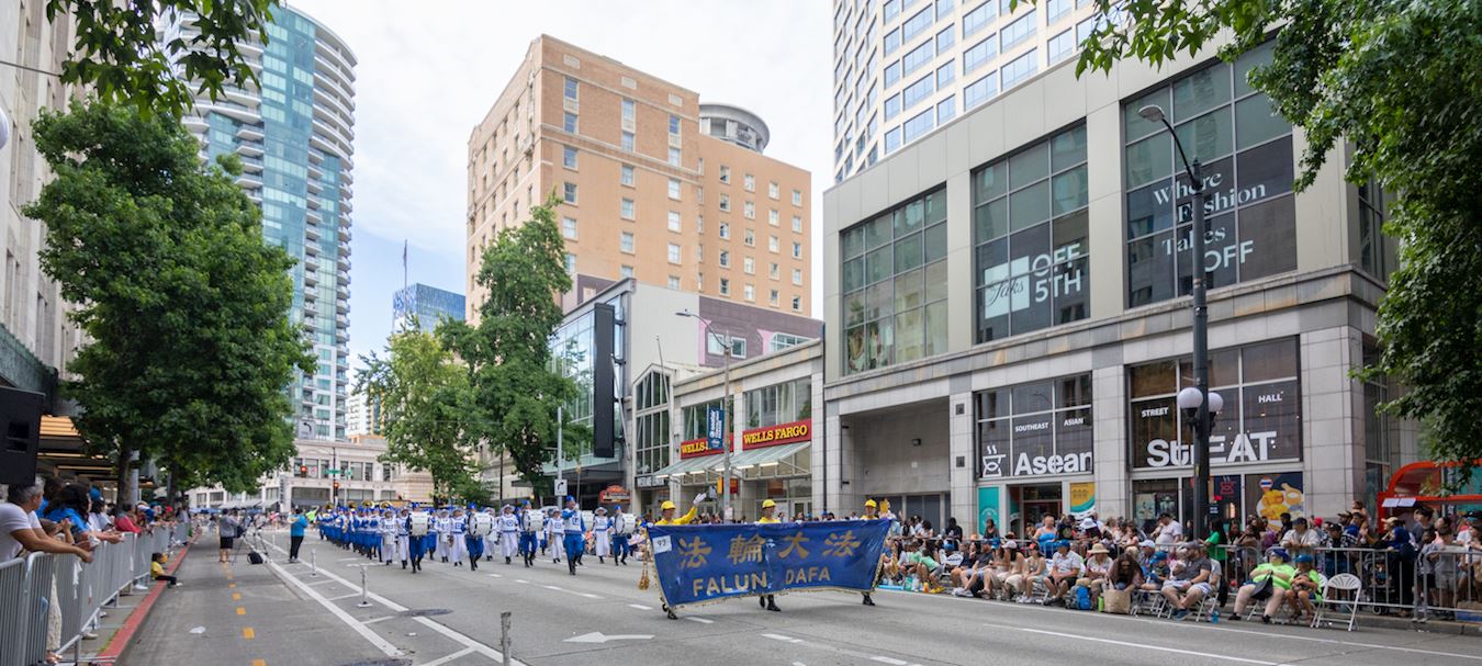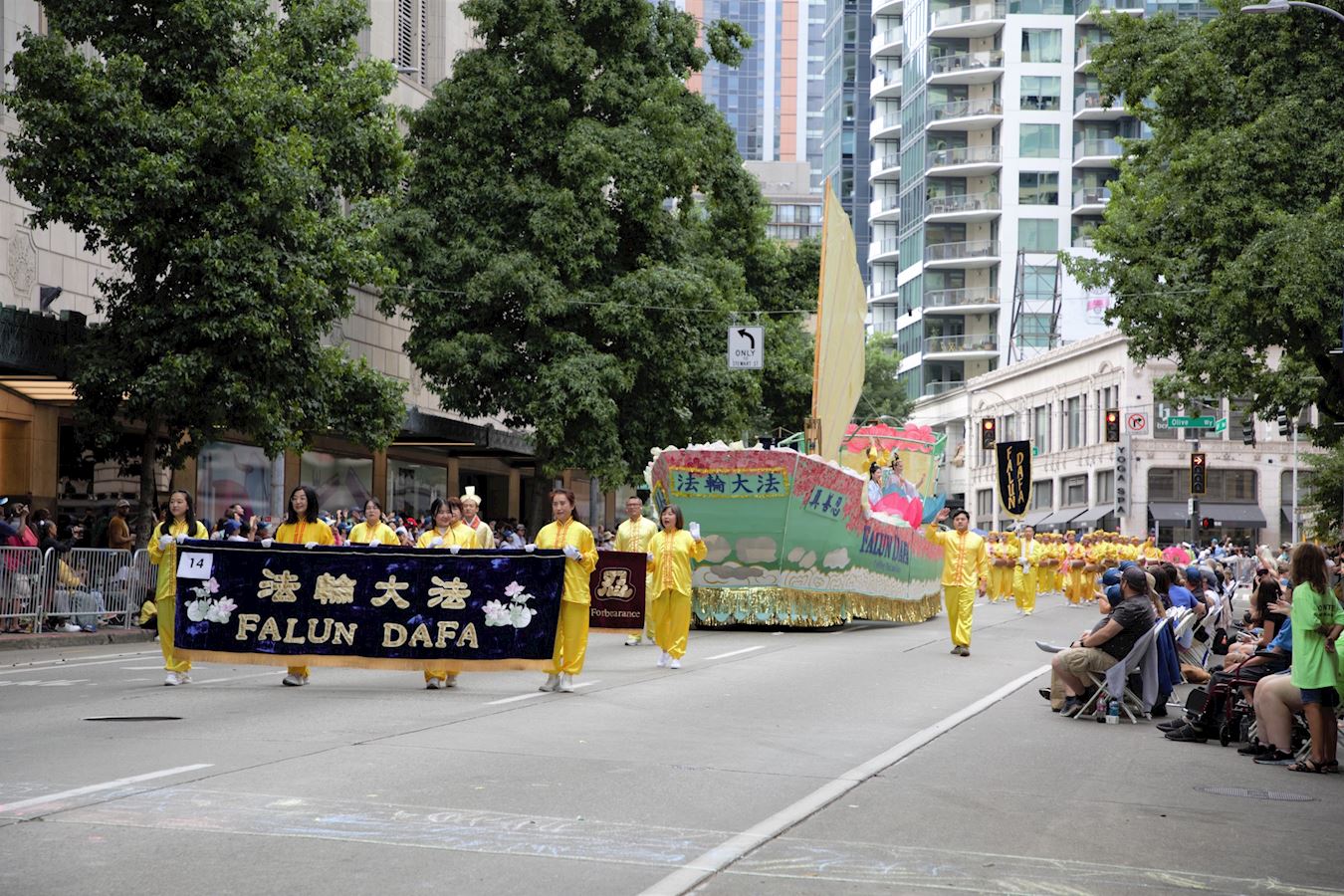 游行从西雅图的地标太空针塔附近开始,沿穿越市中心的第四大道一路前行,到西雅图公共图书馆附近结束,全长约1.2英里。法船花车所到之处,观众纷纷举起手机拍照,挥手致意。有些观众在学着花车上学员的炼功示范做动作,还有些人从远处凑近观看法船花车。每当花车上高达七米的风帆升起时,观众们都会发出阵阵惊呼,赞叹不已。