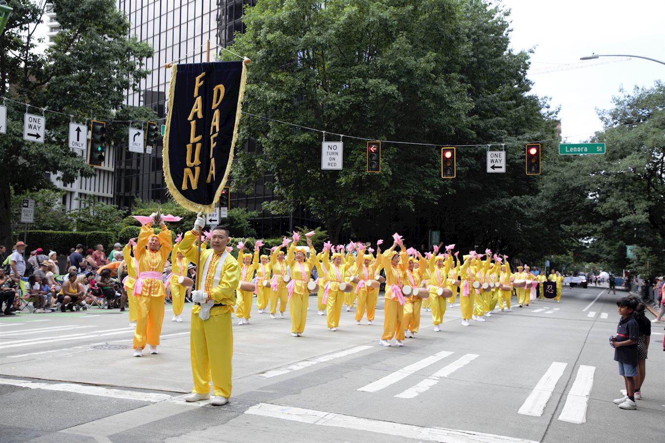 伴随着花车上播放的音乐,由西雅图和温哥华法轮功学员共同组成的腰鼓队为观众们表演了《法轮大法好》、《喜庆》、《天灭中共》等曲目。学员们面带慈悲与喜悦,动作整齐又有活力。很多观众跟随着节奏与鼓点一起挥动手臂。一曲完毕,学员们都会挥动鼓槌向左右两边观众招手,观众们则会回报以更为热烈的掌声和欢呼。在队伍停下来等待时,很多观众来和腰鼓队员合影。